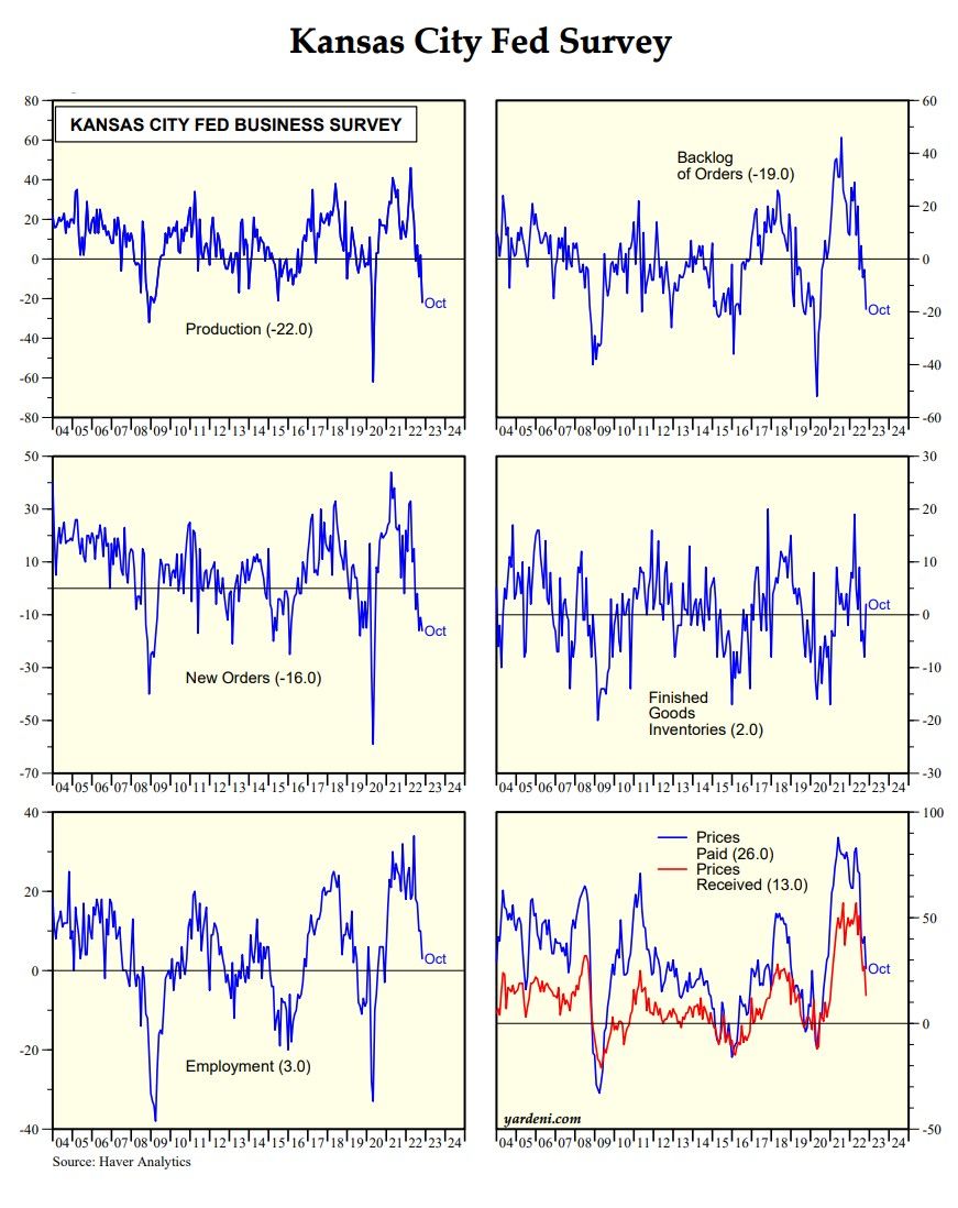 The four October surveys show a soft landing in economic activity (so far) with some moderation in inflationary pressures, while employment is holding up reasonably well. Here are October's business conditions, orders, and employment index readings for the regional surveys: New York (-9.1, 3.7, 7.7), Philadelphia (-8.7, -15.9, 28.5), Richmond (-10.0, -22.0, 0.0), and Kansas City (-7.0, -16.0, 3.0).