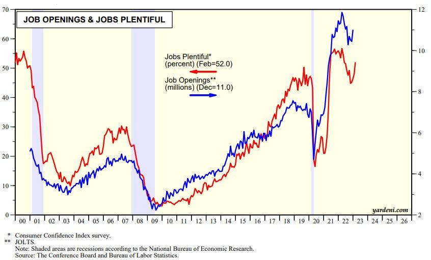 The Fed would like to see fewer job openings to help moderate wage inflation. The time series is reported in the JOLTS report. January's update comes out March 8. It could jolt the Fed into remaining hawkish. That's because it is highly correlated with the The Conference Board's "jobs plentiful" series that came out today and that's been up two months in a row through February (chart).