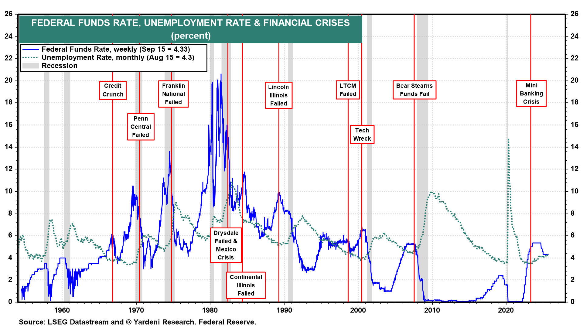More often than not in the past, monetary easing cycles started when the previous tightening of monetary policy triggered a financial crisis that quickly turned into an economy-wide credit crunch and a recession. Easing at such times is clearly warranted. But the Fed cut the FFR by 100bps at the end of last year even though there was no credit crunch and no recession (chart). That makes another round of rate cuts in this cycle more likely to cause inflation to remain above the Fed's target, while fueling speculative fires in the stock market.