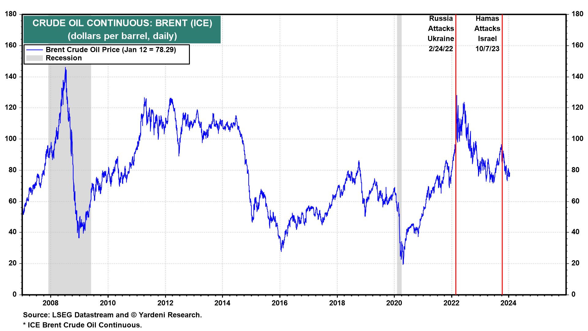 Chevron CEO Michael Wirth warned yesterday in a CNBC interview that the Red Sea crisis could disrupt oil supplies and quickly push oil prices higher: "So much of the world's oil flows through that region that were it to be cut off, I think you could see things change very rapidly," he said. So what did the price of oil do today? It edged down (chart).