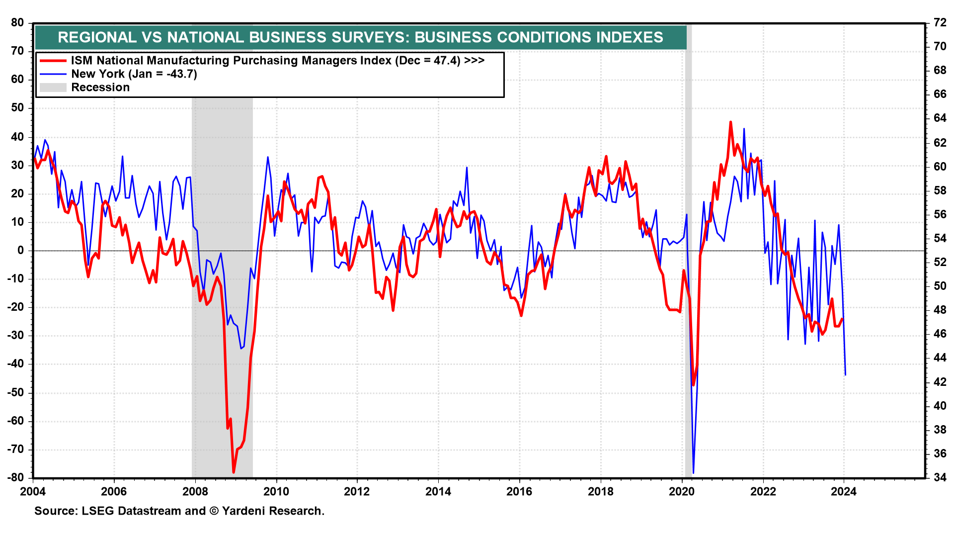 On the home front, the only significant economic news today was a sharp drop in the business activity index in the NY Fed's district according to the bank's January survey (chart). It is highly correlated with the national M-PMI. However, it has been extremely volatile over the past couple of years.