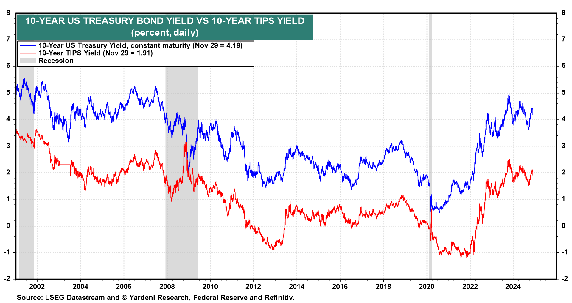 A revival in US goods production would likely boost bond yields as growth expectations increase. The 10-year Treasury yield could breach 4.5% by year-end in that scenario while the inflation-adjusted TIPS yield climbs above 2.0%, similar to where they traded before the Great Financial Crisis (chart).