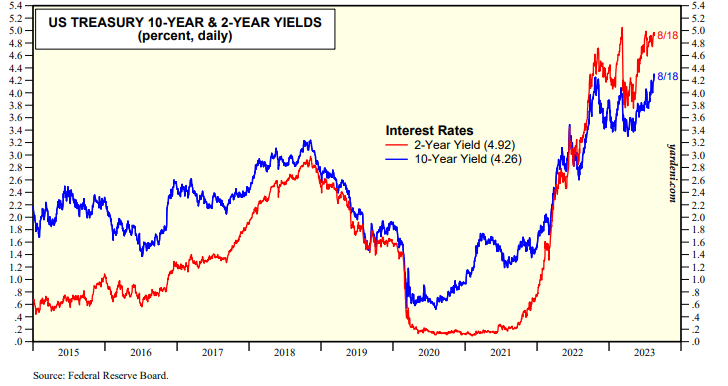 Does the Fed really want to see the yield curve "disinvert" with the 10-year Treasury bond yield (currently 4.26%) rising up to the 2-year Treasury note yield (currently 4.92%) (chart)? We will find out on Friday, when Fed Chair Jerome Powell speaks at the Fed's annual Jackson Hole conference.