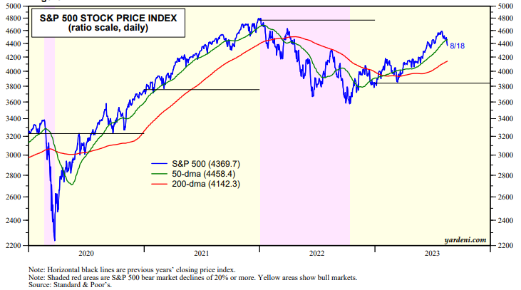 The uncertainty of which version of disinversion will play out is weighing on the stock market (chart). The S&P 500 dropped below its 50-day moving average last week. It is now down 4.95% from its July 31 bull market high. If Powell doesn't calm the bond market, then the S&P 500 could continue to fall towards its 200-dma. That would be almost a 10% decline from July 31. Nevertheless, we still expect a yearend rally to boost the S&P 500 back to 4600 if inflation continues to moderate, as we expect, causing the bond yield to stop climbing.