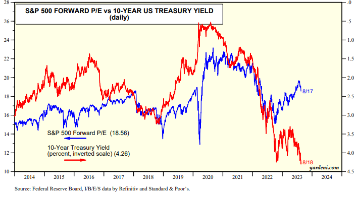 The rising bond yield has been weighing on the S&P 500 forward P/E since August 1, when Fitch downgraded US government debt (chart).