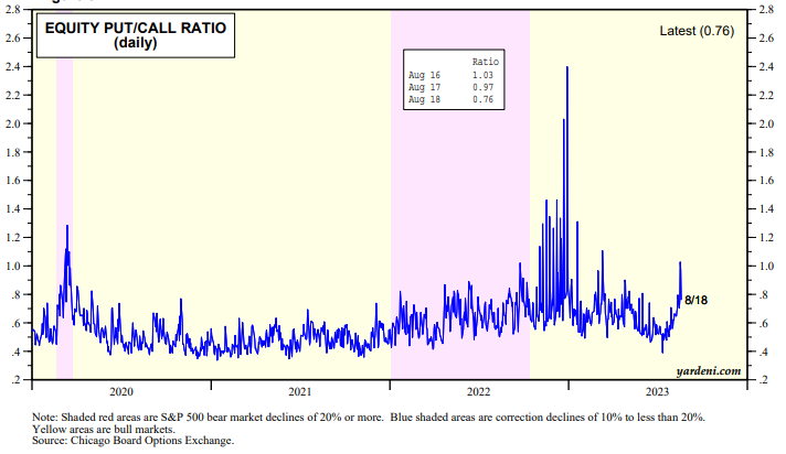 The equity put/call ratio has been trending higher suggesting that investors are starting to worry more about the downside risks of the market (chart).