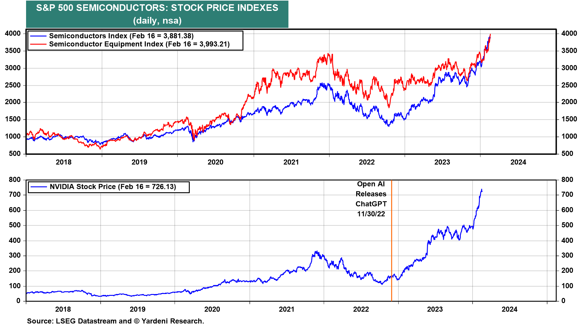 You have been warned: Headlines like these could turn the bull market into a meltup and then a meltdown. We continue to be alert to such signals that might send the S&P 500 to our year-end target of 5400 well ahead of schedule, say by mid-year. For now, Information Technology continues to lead the bull market as semiconductor stocks go parabolic along with Nvidia (chart).