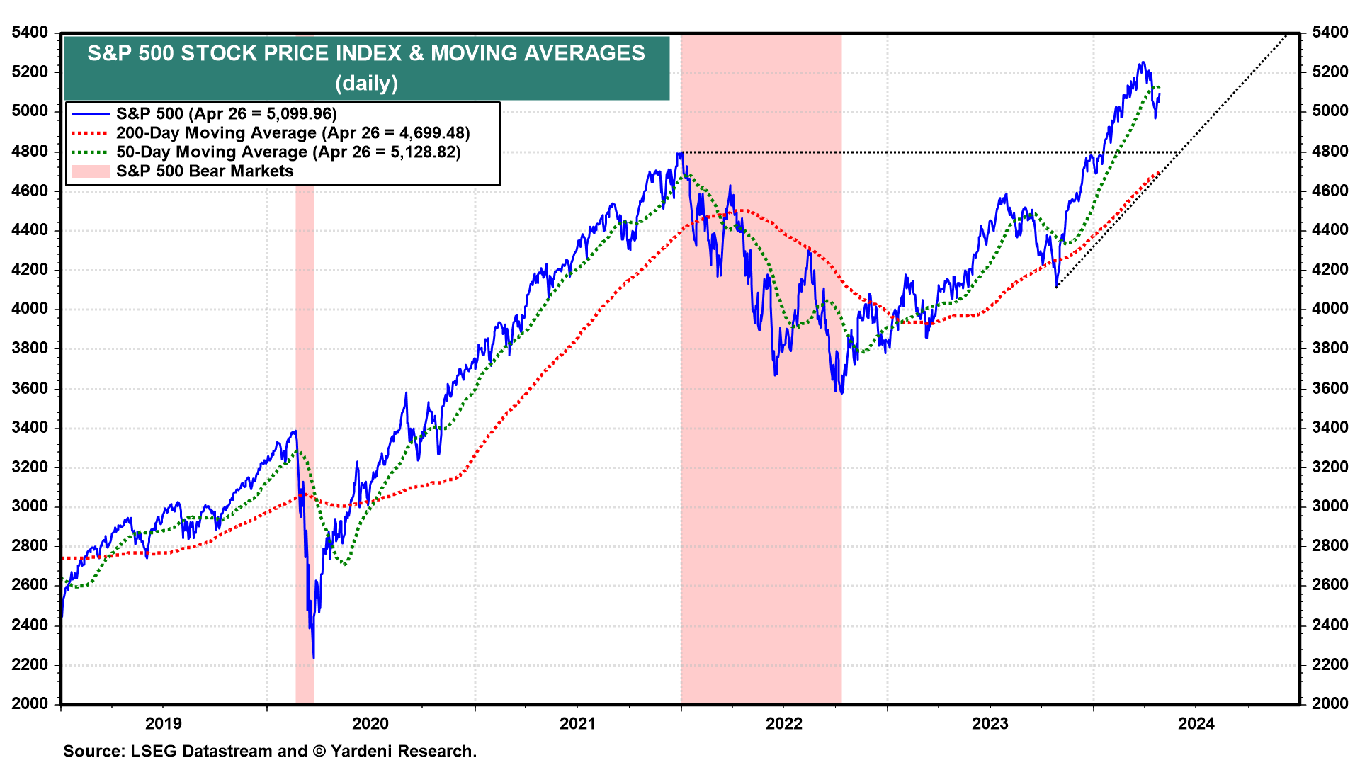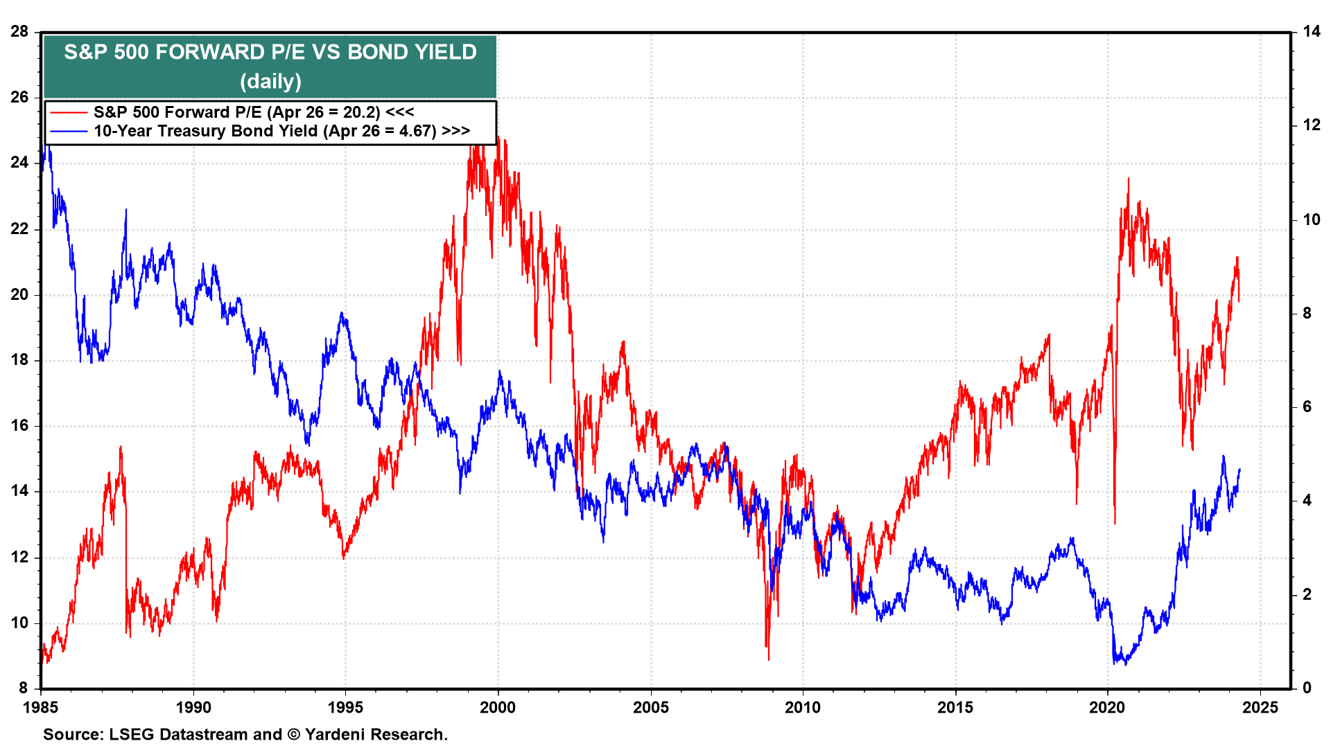 Meanwhile, the earnings reporting season is going well as evidenced by S&P 500 forward earnings, which rose to a record high of $253.54 during the April 25 week (chart). Google and Microsoft beat expectations and they also beat inflation fears following Friday's hotter-than-expected PCED inflation reading.