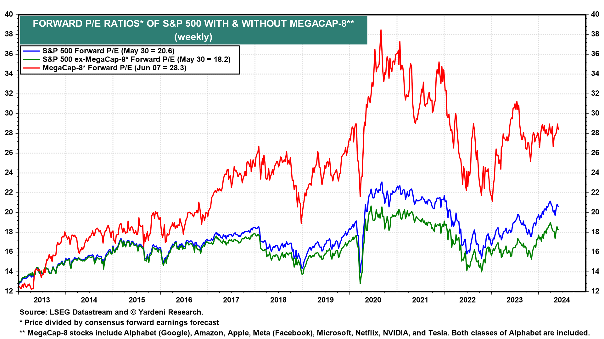 The S&P 500's forward P/E with and without the MegaCap-8 stocks is currently 20.6 and 18.2 (chart). The MegaCap-8 is currently trading at a forward P/E of 28.3.