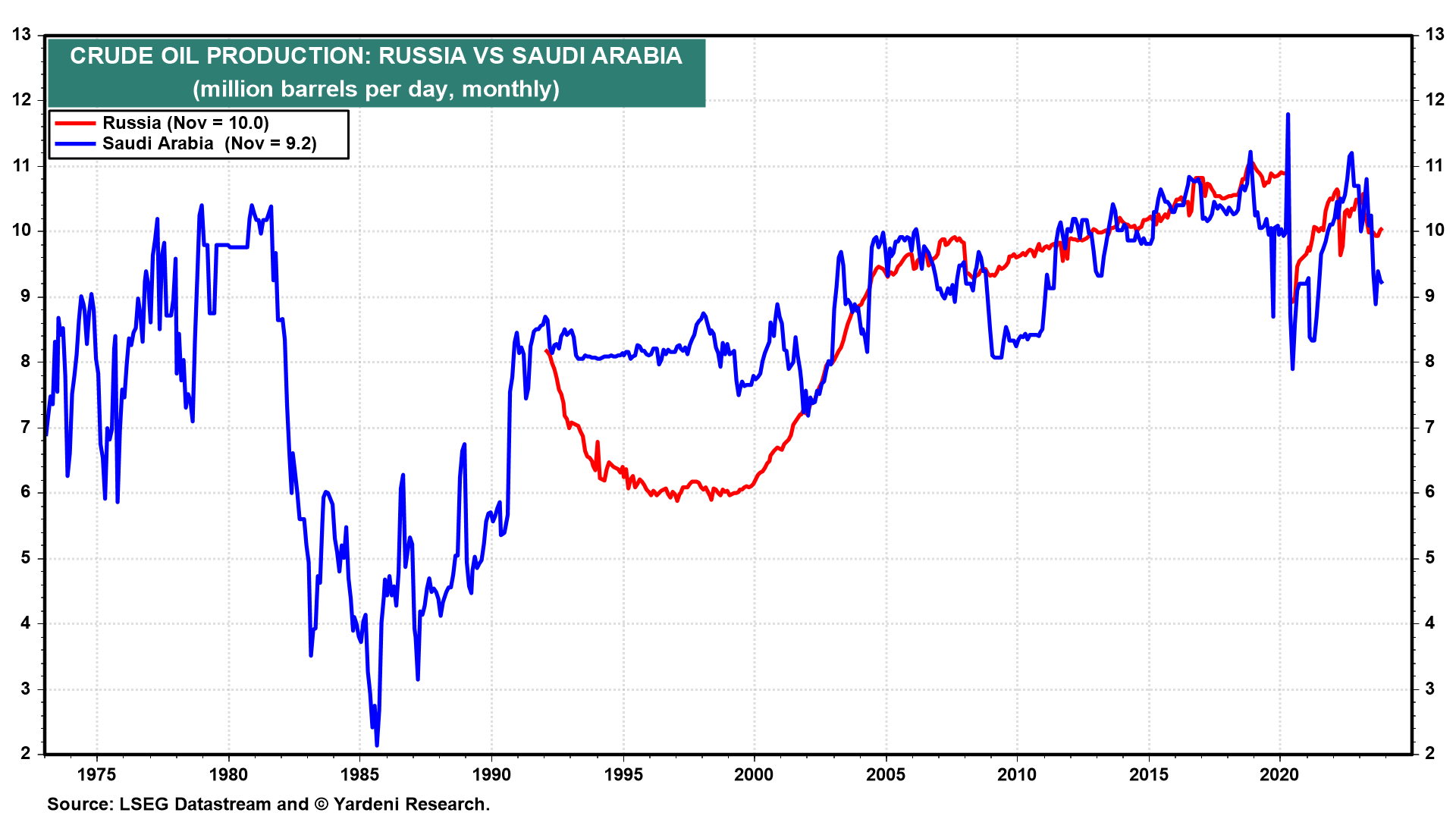 We might have to increase the odds of a 1970s-like scenario if the price of oil continues to rise. Our very good friend Steve Soukup posted an April 6 article titled "Saudi Arabia and the Tale of Two Presidents." You should read it. The basic thesis is that the Saudis might like to see President Joe Biden lose to Donald Trump. So they might do whatever they can to boost the price of oil before the November election. Both the Saudis and Russians started reducing their output last summer (chart).