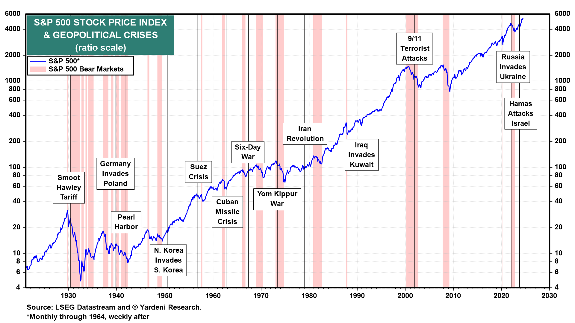 We've previously written that our number one concern for the stock market is unsettling domestic and global political turmoil. The attempt to assassinate former President Donald Trump on Saturday heightened anxiety about political violence at home as the November elections approach. On the global stage, the violence of the wars between Ukraine and Russia and in the Middle East seems to be escalating. Then again, the stock market has a history of tuning out domestic and global political shocks, which more often than not turn out to create buying opportunities for stock investors (chart).