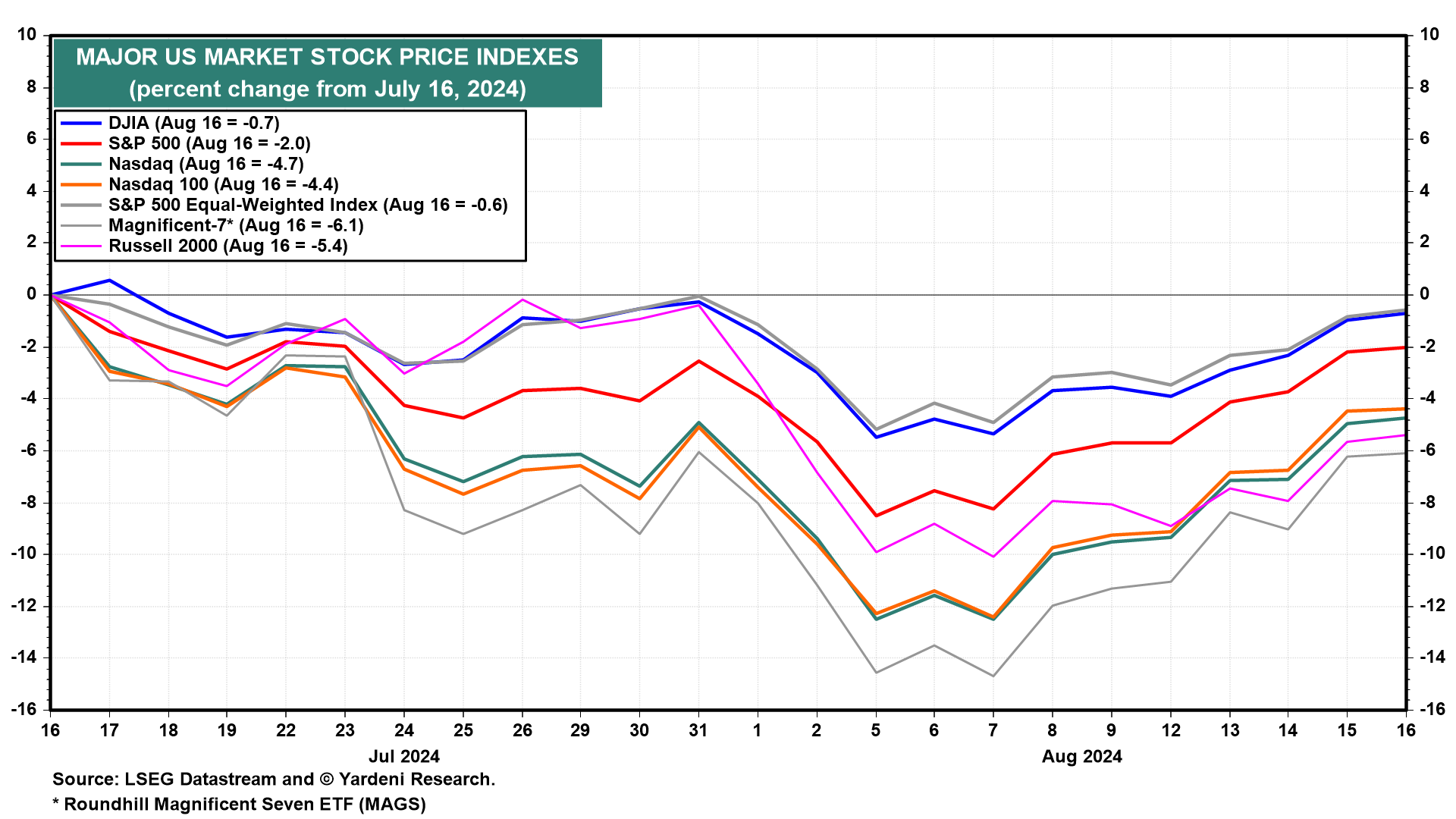 It has been quite a bungee jump in the stock market since the S&P 500 peaked at a record high on July 16 (chart). It wouldn't take much to see the S&P 500 at a new record high since it is only down 2.0% from its July 16 record high of 5667.20!