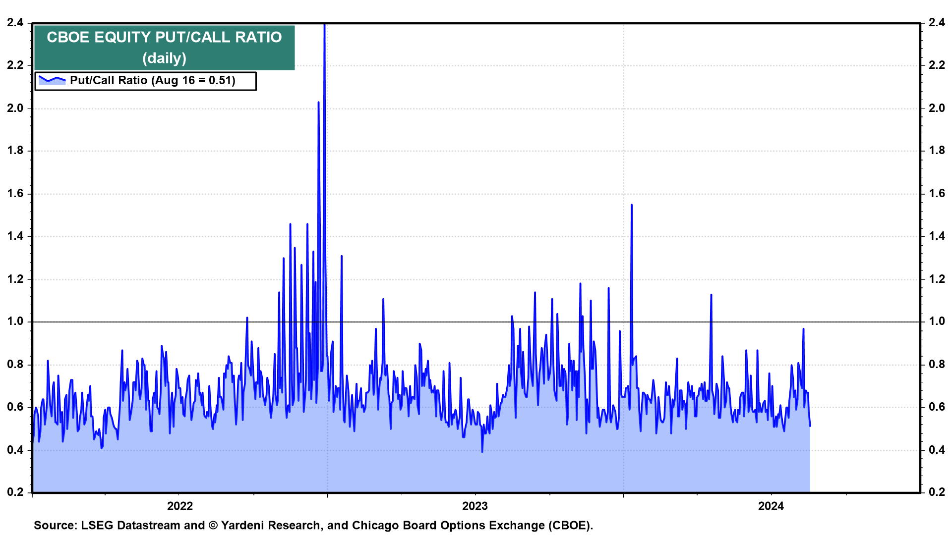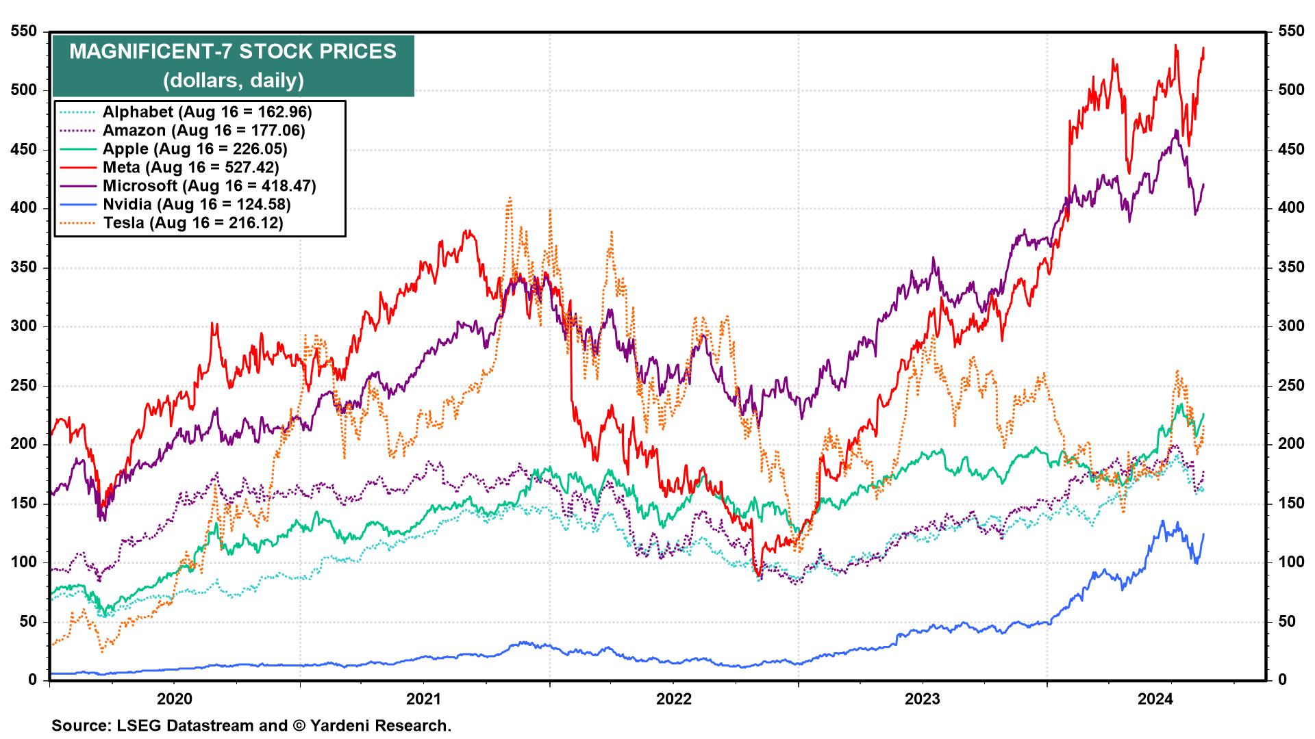 The stock market rebounded sharply last week from the prior week's drop, after July's soft employment report (released on August 2) heightened recession fears, which abated especially after July's strong retail sales report (released on August 15). The stock market's drop at the start of August was exacerbated by the unwinding of carry-trades. But that bearish development also dissipated quickly.