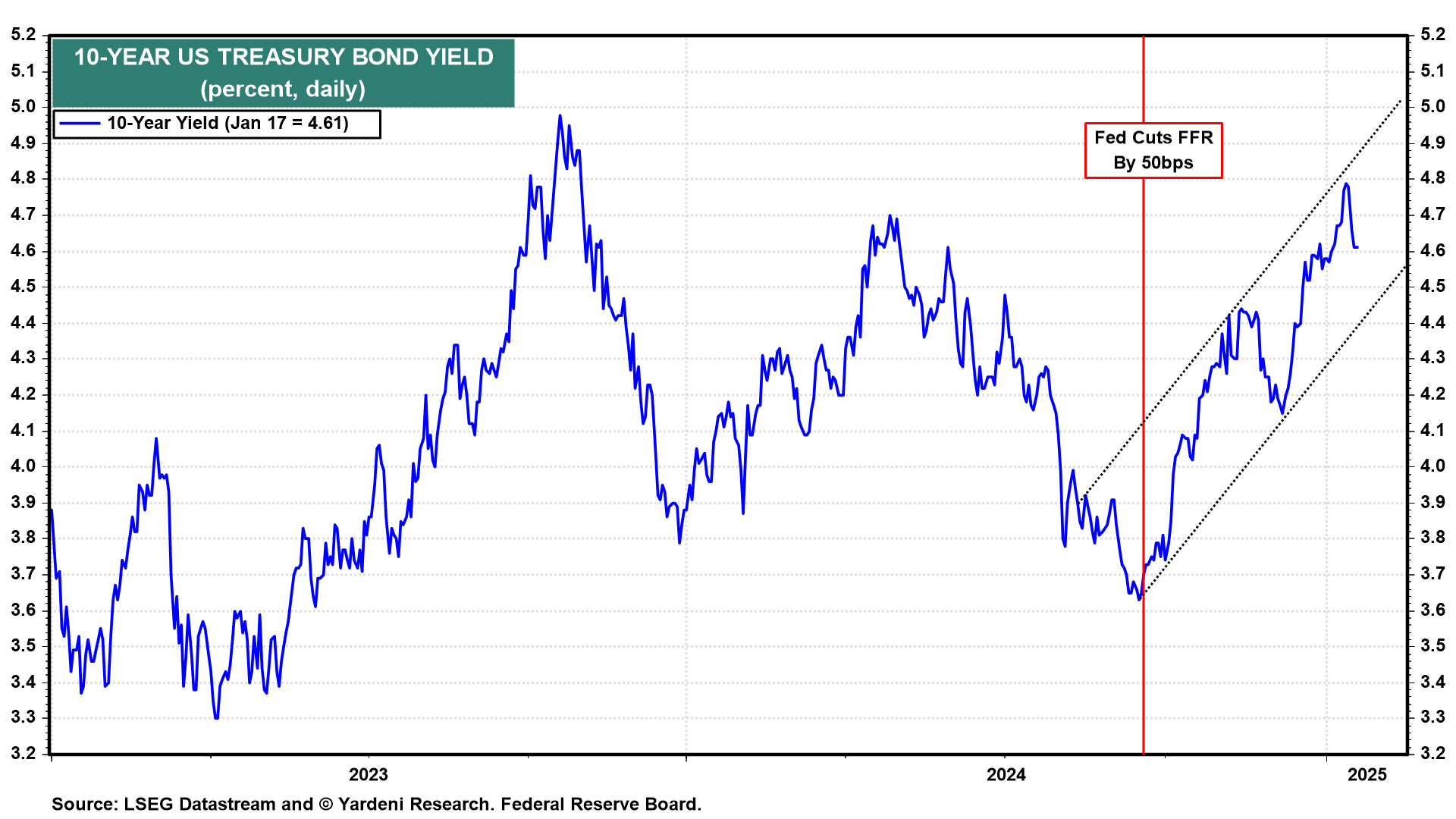 Also last Thursday, the big banks reported better-than-expected earnings for Q4-2024. Collectively, analysts now expect S&P 500 earnings to rise 9.1% y/y for the quarter, up from their previous estimate of 8.2% (chart). We are raising our Q4 earnings growth estimate from 10.0% to 12.0% y/y. We had thought it would be a strong earnings reporting season. Now we think it will be even stronger.