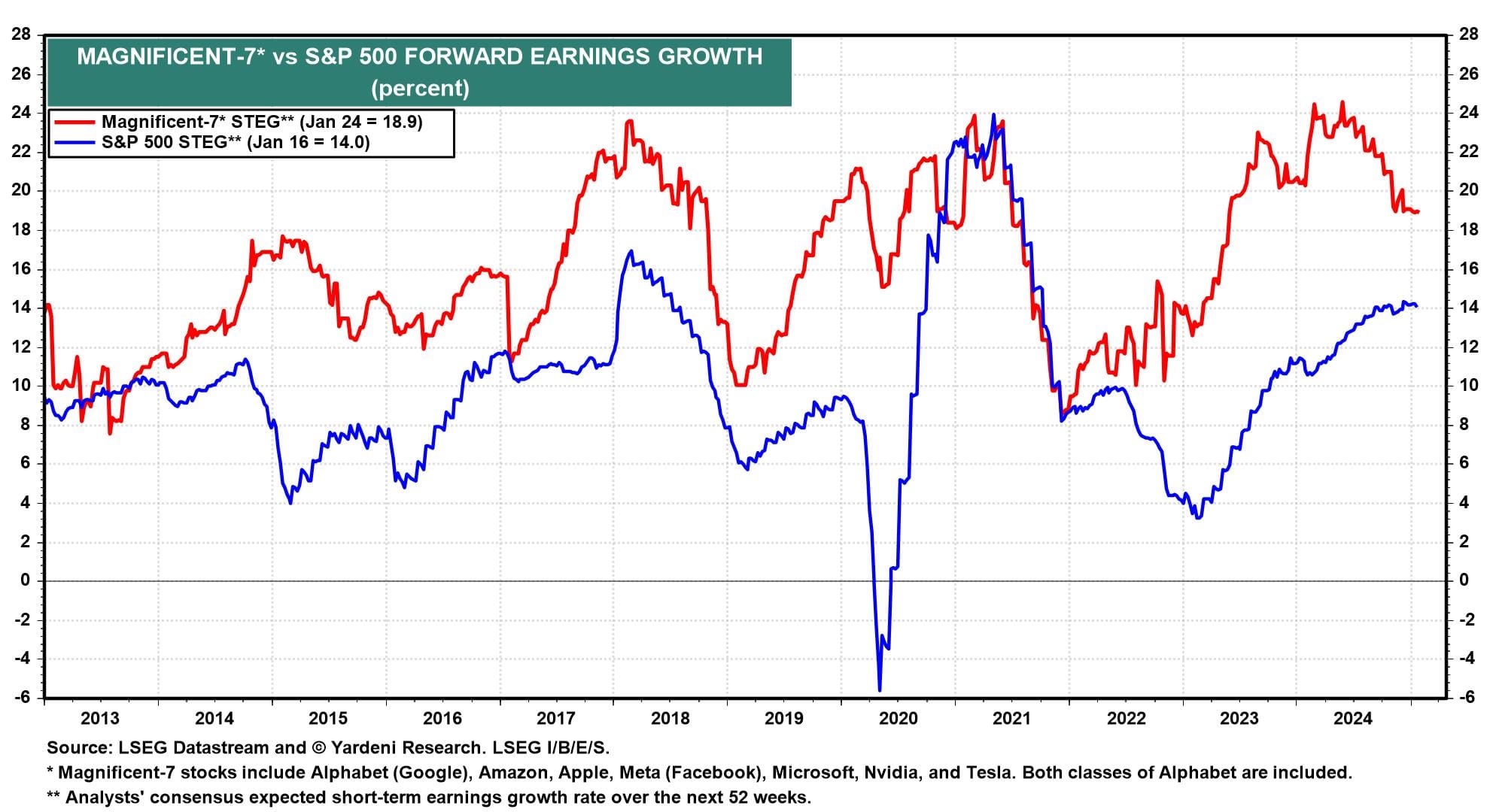 The consensus of industry analysts who follow the Mag-7 is showing that their short-term forward earnings growth rate (STEG) was 18.9% as of the January 24 week, down from almost 25.0% at the start of this year (chart). Interestingly, the STEG of the overall S&P 500 has risen from around 10% to almost 15% over this same period. Analysts must be raising their STEG for the S&P 493.