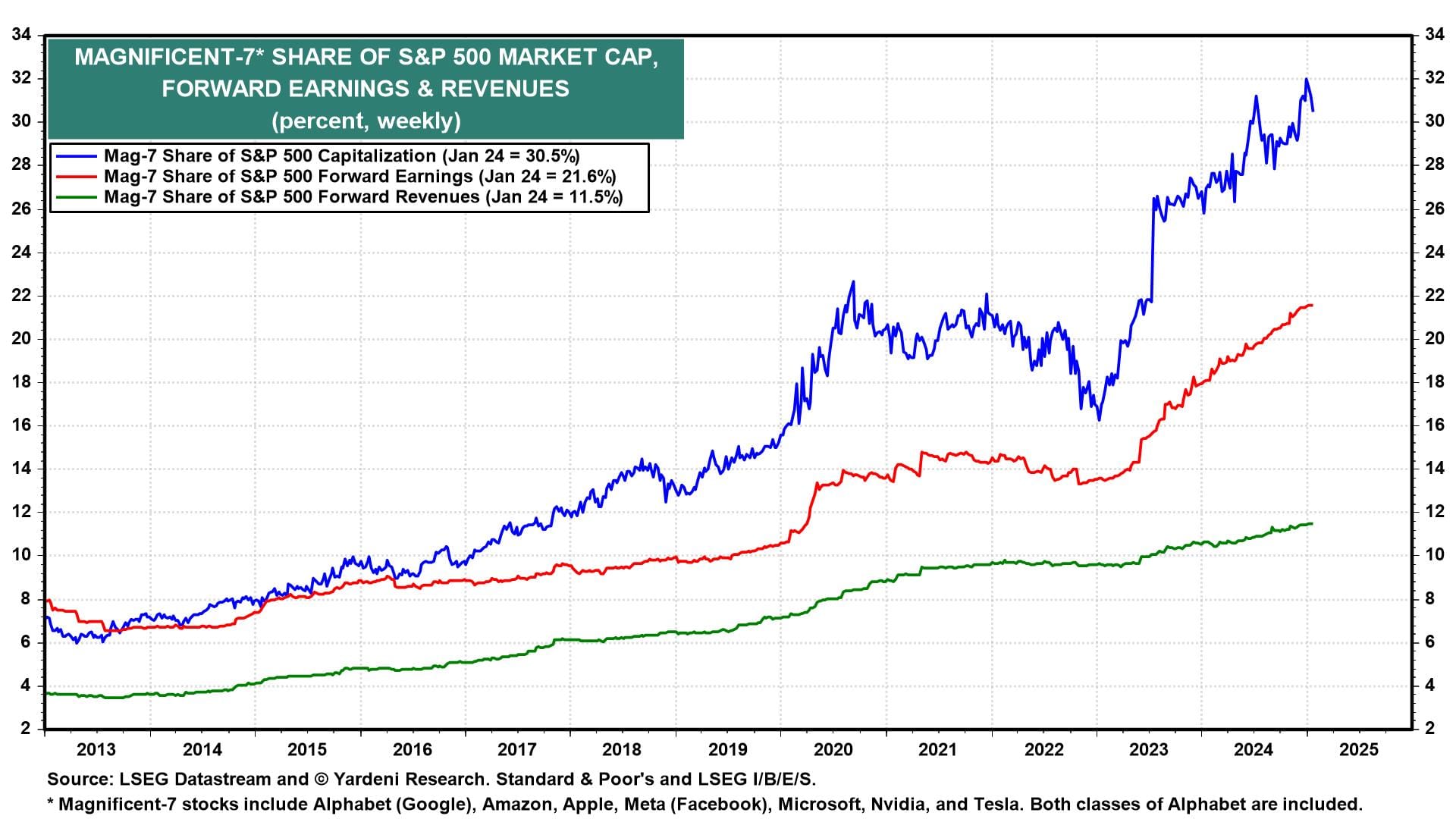 If the Mag-7's Q4 earnings disappoint, these seven stocks could drag the S&P 500 down significantly since they account for a whopping 30.5% of the market cap of the index (chart). They also account for a hefty 21.6% of the forward earnings of the S&P 500 but only 11.5% of forward revenues.