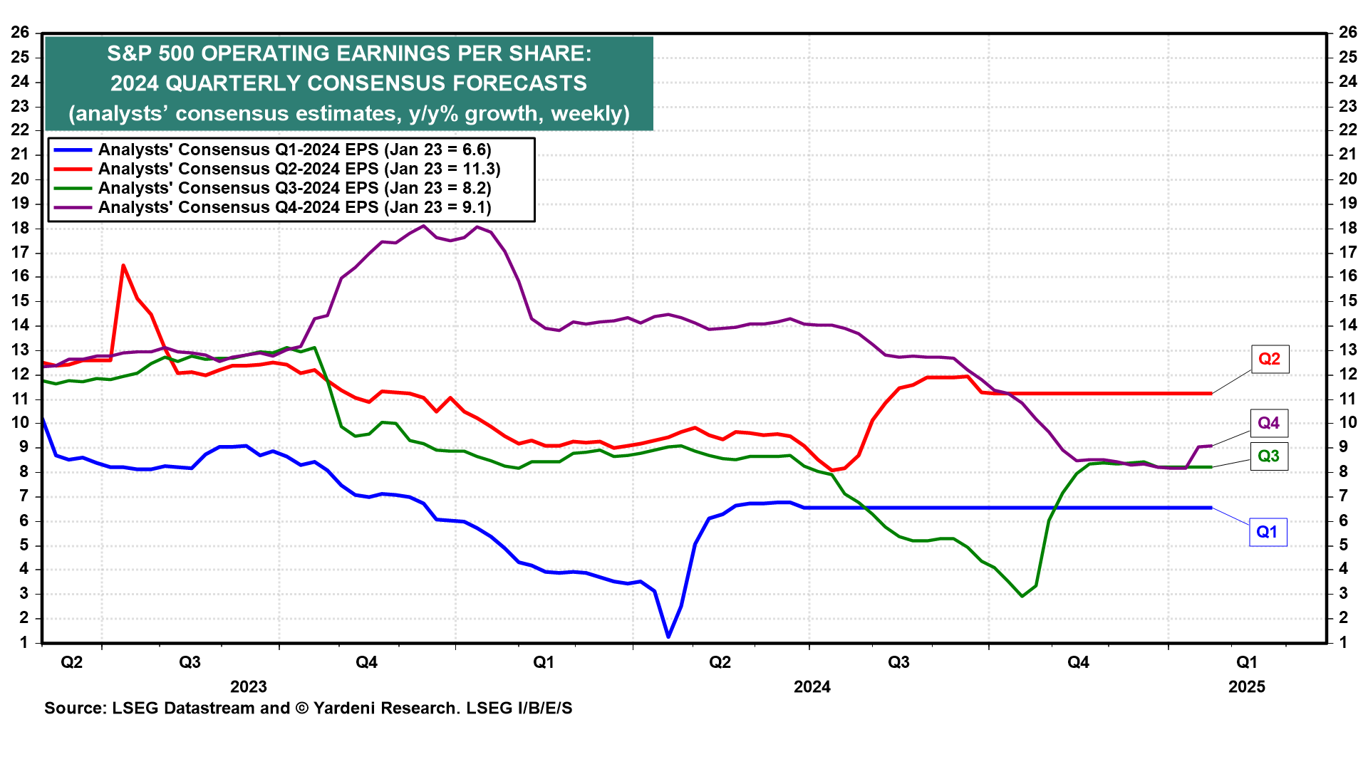 The Q4-2024 earnings reporting season is going well so far. It started out two weeks ago with better-than-expected big bank earnings. As a result, industry analysts increased their consensus expected Q4 earnings growth rate for the S&P 500 companies collectively from 8.2% y/y to 9.1% y/y (chart). We raised our expected earnings growth rate from 10.0% to 12.0%.