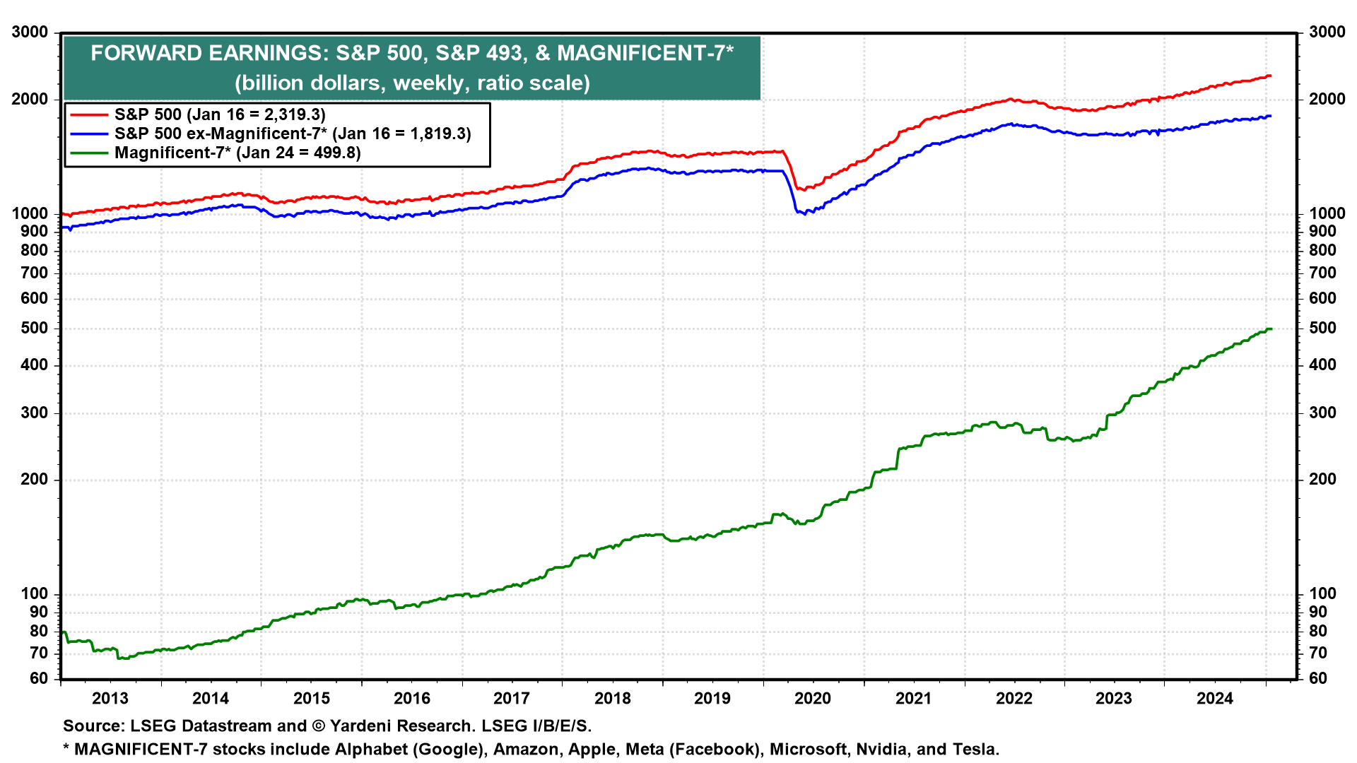 On balance, we expect that the Mag-7 will deliver solid earnings, as suggested by the record high in their combined aggregate forward earnings of $500.1 billion during the week of January 24 (chart). The forward earnings of the S&P 493 was $1,819.3 billion that same week.