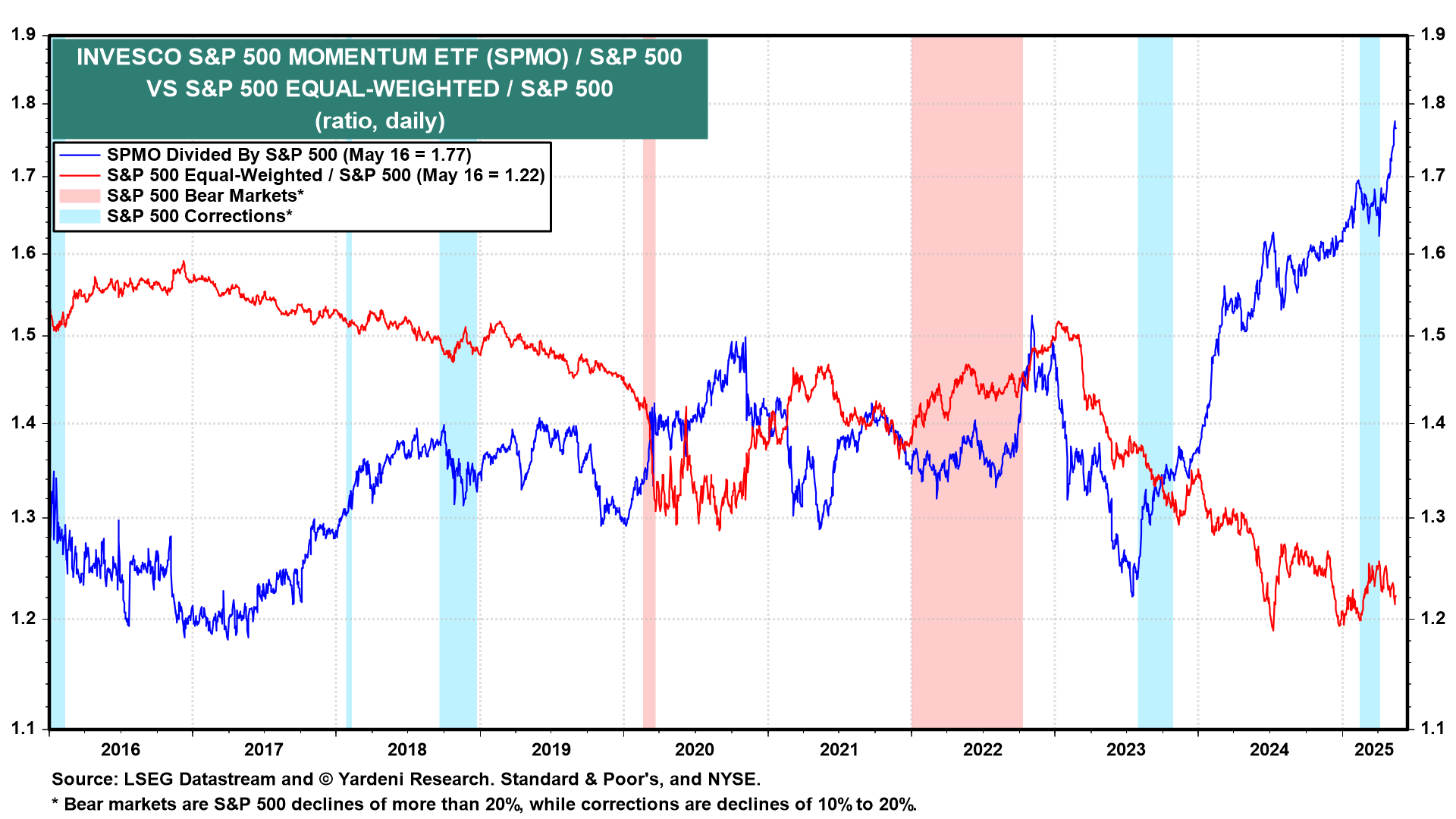The meltup scenario is making a dramatic comeback. It was one of our three scenarios until March 24 when we wrote the following in our Morning Briefing: "We've decided to fold our 1990s meltup/meltdown scenario into our Roaring 2020s scenario. The current correction in the stock market suggests that the former has played out already, as the bull market's highflyers have been hit hardest by the current correction. That leaves us with two scenarios: the Roaring 2020s, to which we assign a 65% subjective probability, and a mostly stagflation scenario, with a 35% probability. The former includes the possibility of a rebound in the former highflyers, while the latter includes the possibility of a recession."