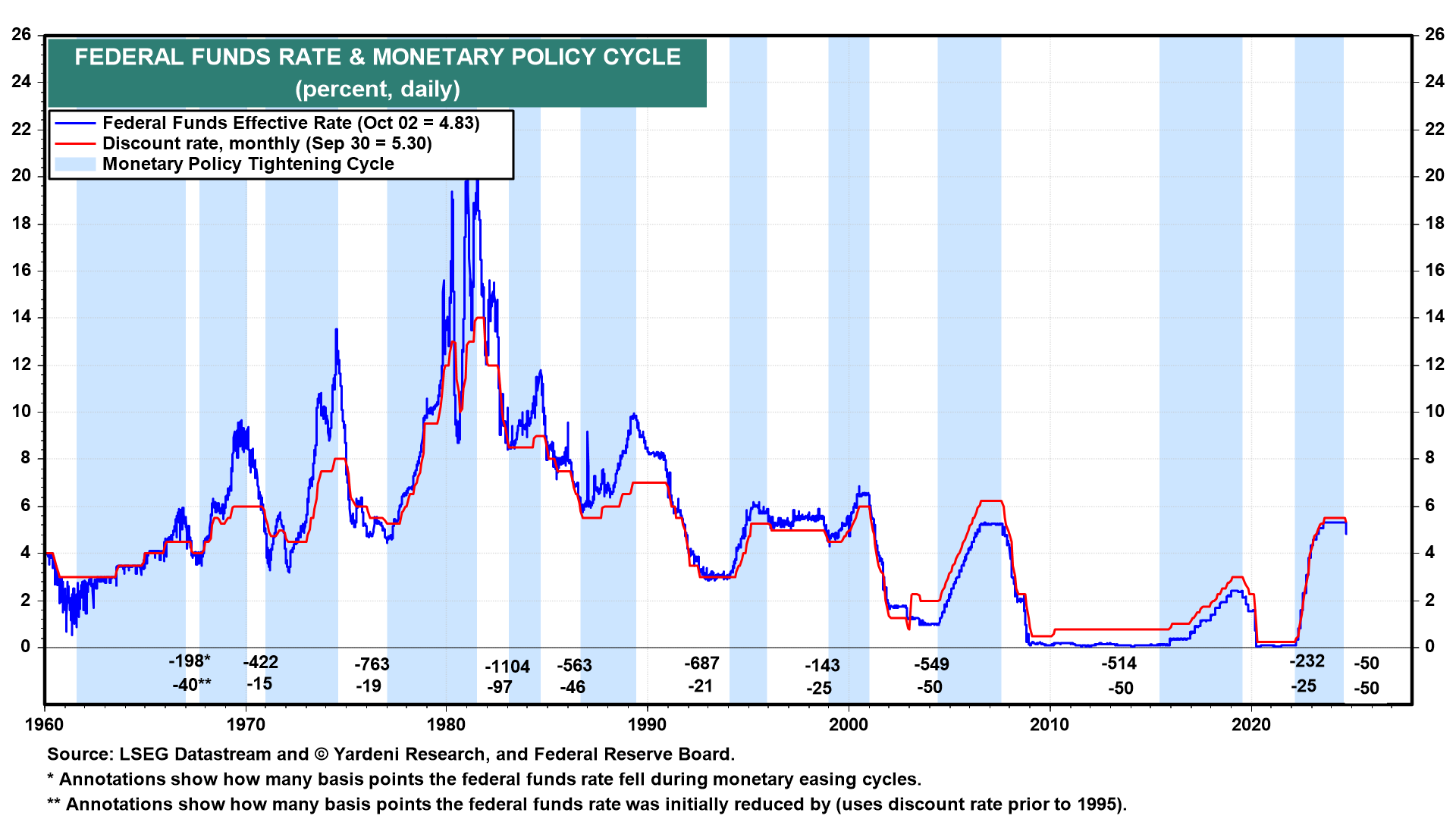 In the past, once the Fed started cutting the FFR, it was followed by a quick succession of additional rate cuts (chart). So far, the difference this time is that there's no credit crisis, credit crunch, or recession. Instead, the economy continues to grow at a solid pace around 3.0% on a y/y basis. So there's no rush for the Fed to ease, especially if the economy continues performing well.