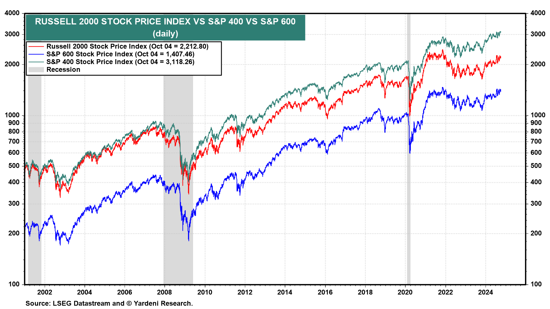 In recent weeks, everyone agreed that lower interest rates should be bullish for smaller companies with floating-rate debt. The Russell 2000, S&P 400 MidCaps, and the S&P 600 SmallCaps have been rallying this year on expectations of Fed easing (chart). So have the S&P 500 Utilities and Real Estate sectors.