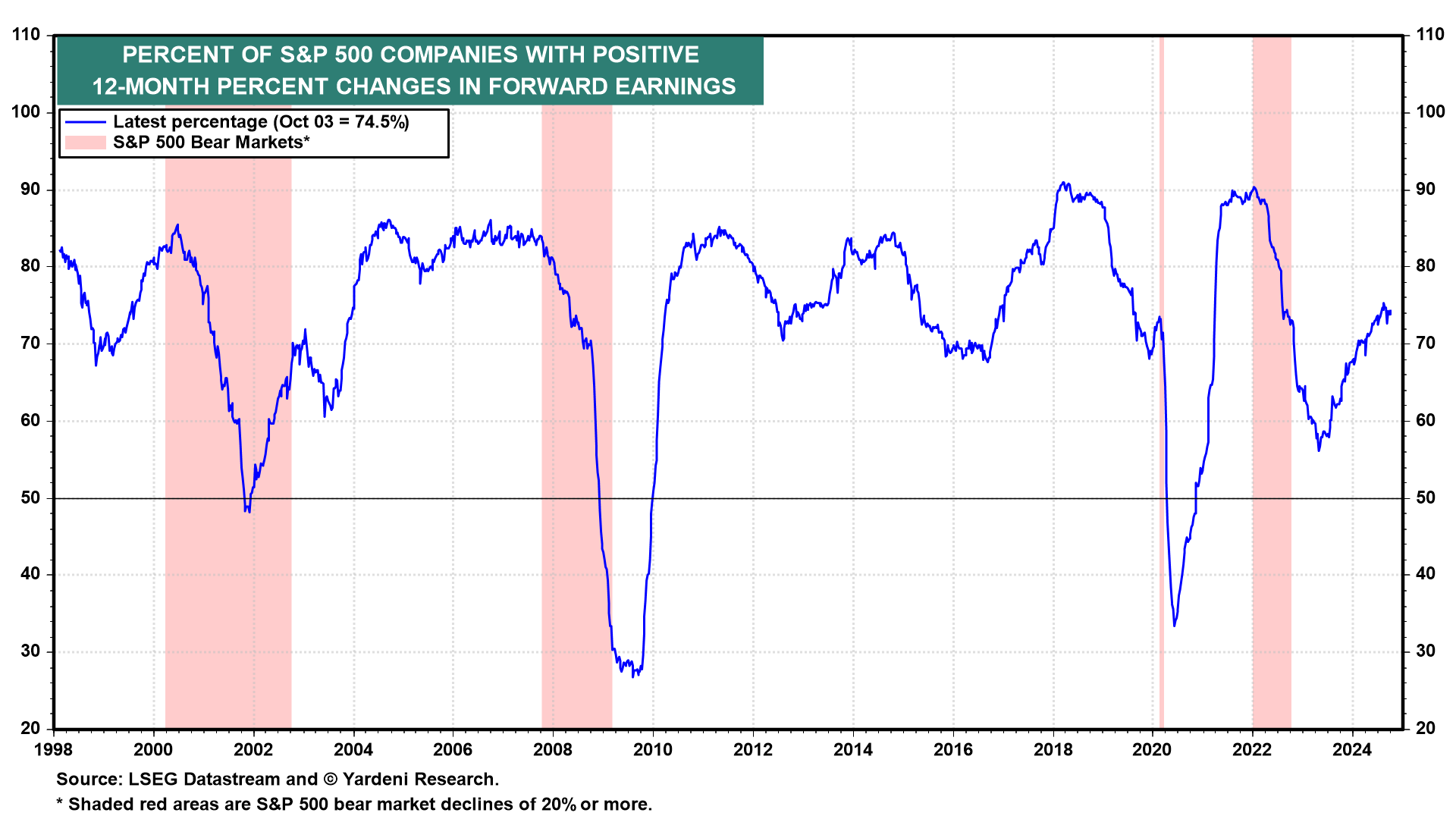 We still expect that the bull market in stocks will continue to broaden, but it is more likely to broaden from the Magnificent-7 to the S&P 493 than to the S&P 400/600 SMidCaps. As the economy continues to expand, more of the S&P 500 companies are showing positive y/y comps for forward earnings (chart).