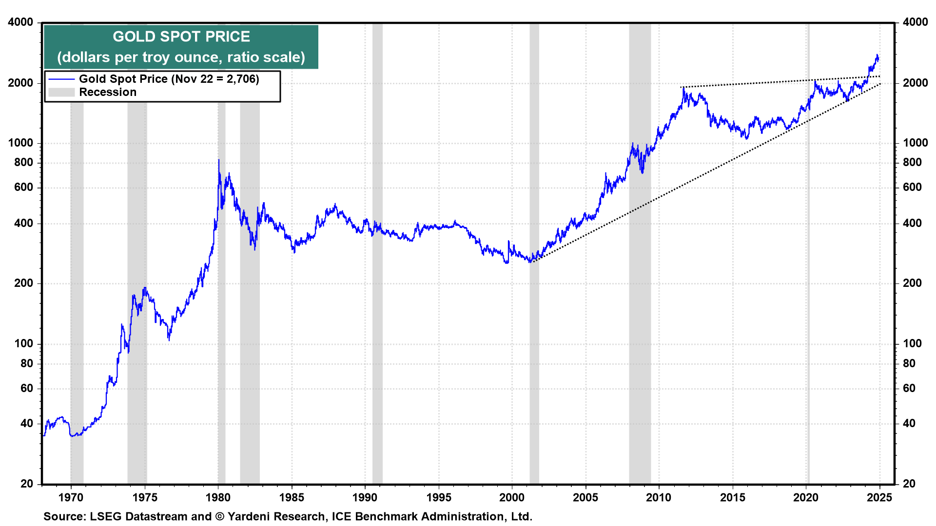 By comparison, the price of gold rose only 20-fold during the 1970s after President Richard Nixon closed the Gold Window on August 15, 1971 (chart). That effectively devalued the dollar, boosted inflation, and created a surge in demand for gold. During the current bull market in gold that started in 2002, the price of the precious metal has risen almost 10-fold.