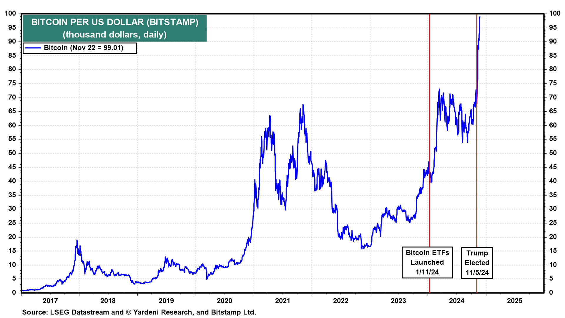 Can Bitcoin soar from $100,000 to $1 million. Sure, why not? It already increased almost 7-fold just since early 2023, 10-fold since mid-2020, and 100-fold since early 2017 (chart).
