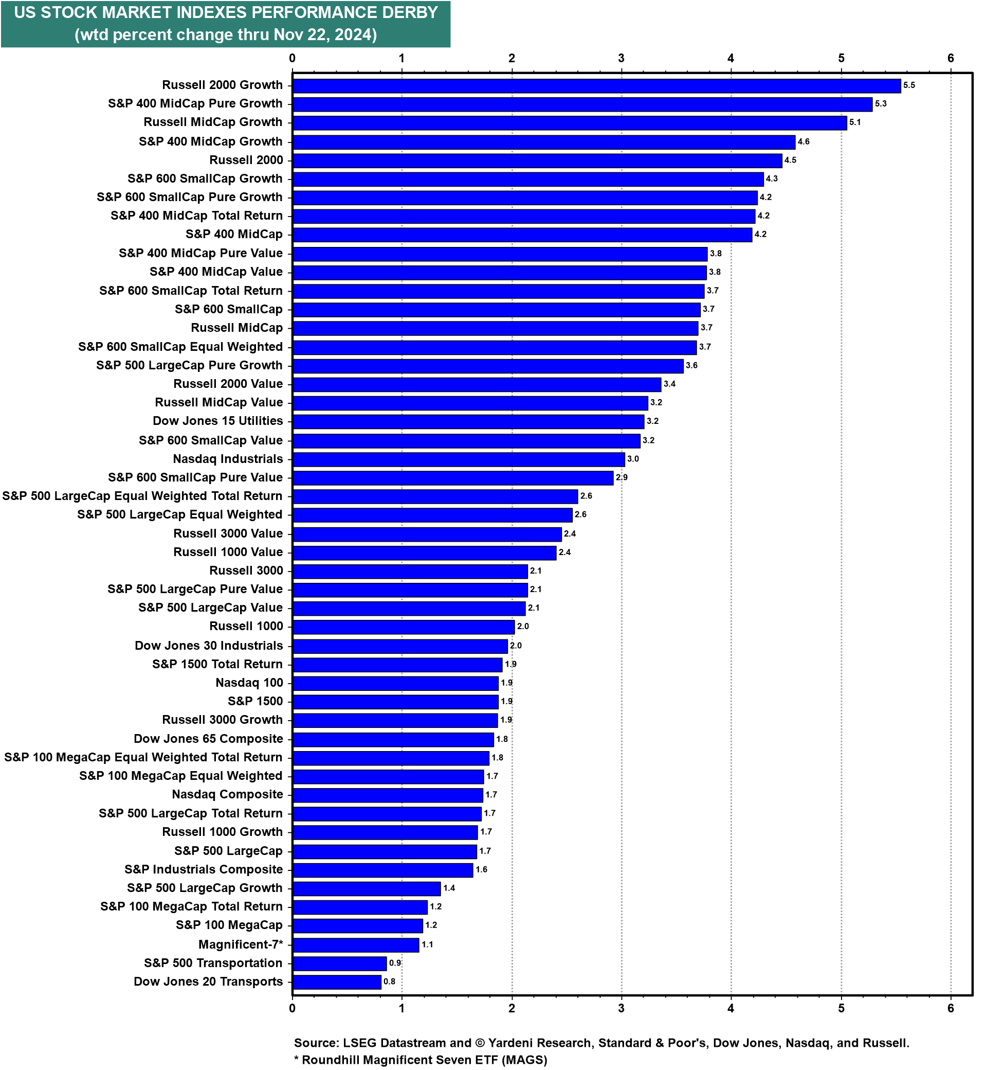 By comparison, the US stock market's returns seem like chump change. Nevertheless, last week was another good one for stocks as the market continued to broaden to smaller cap stocks (table).