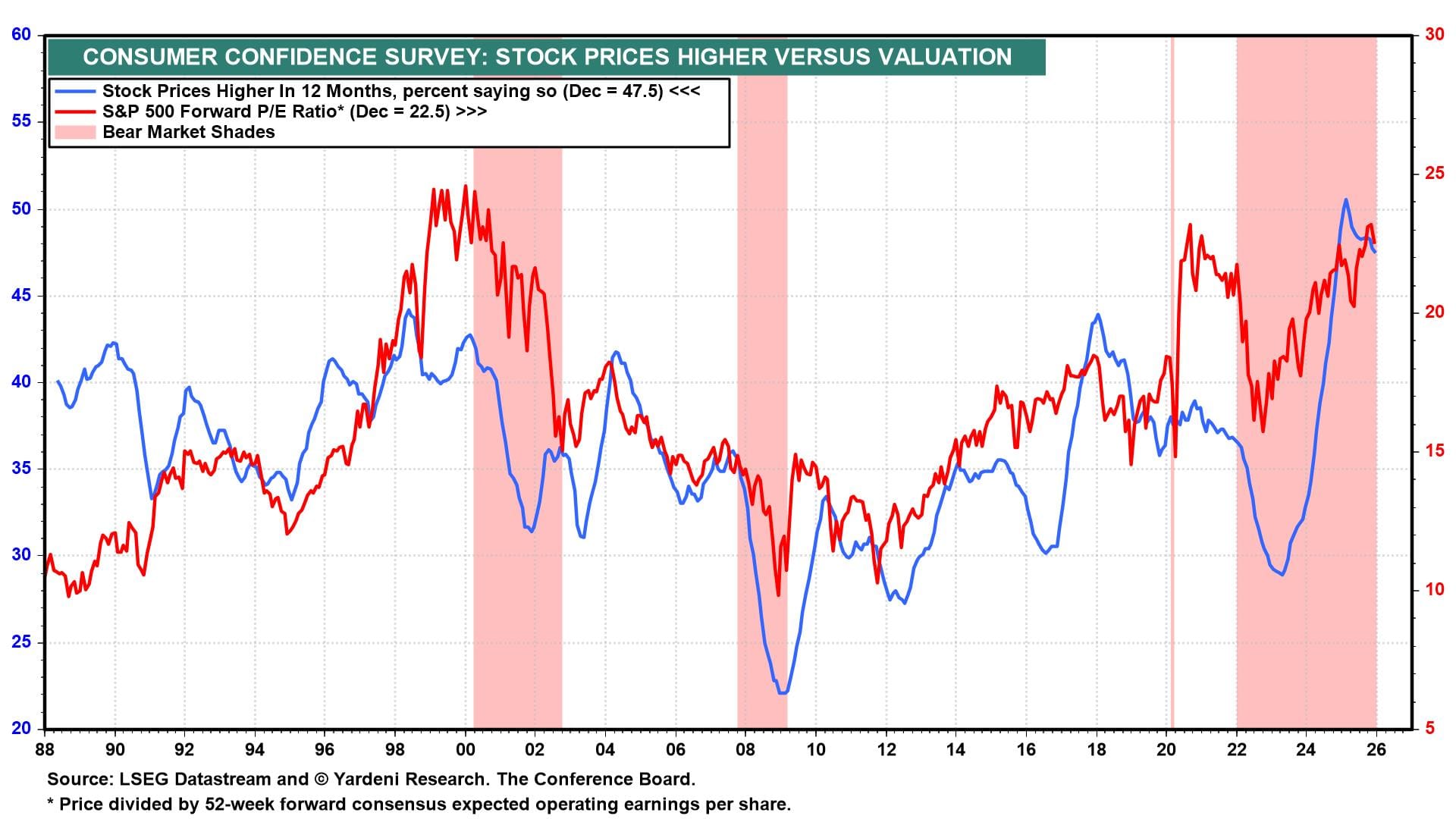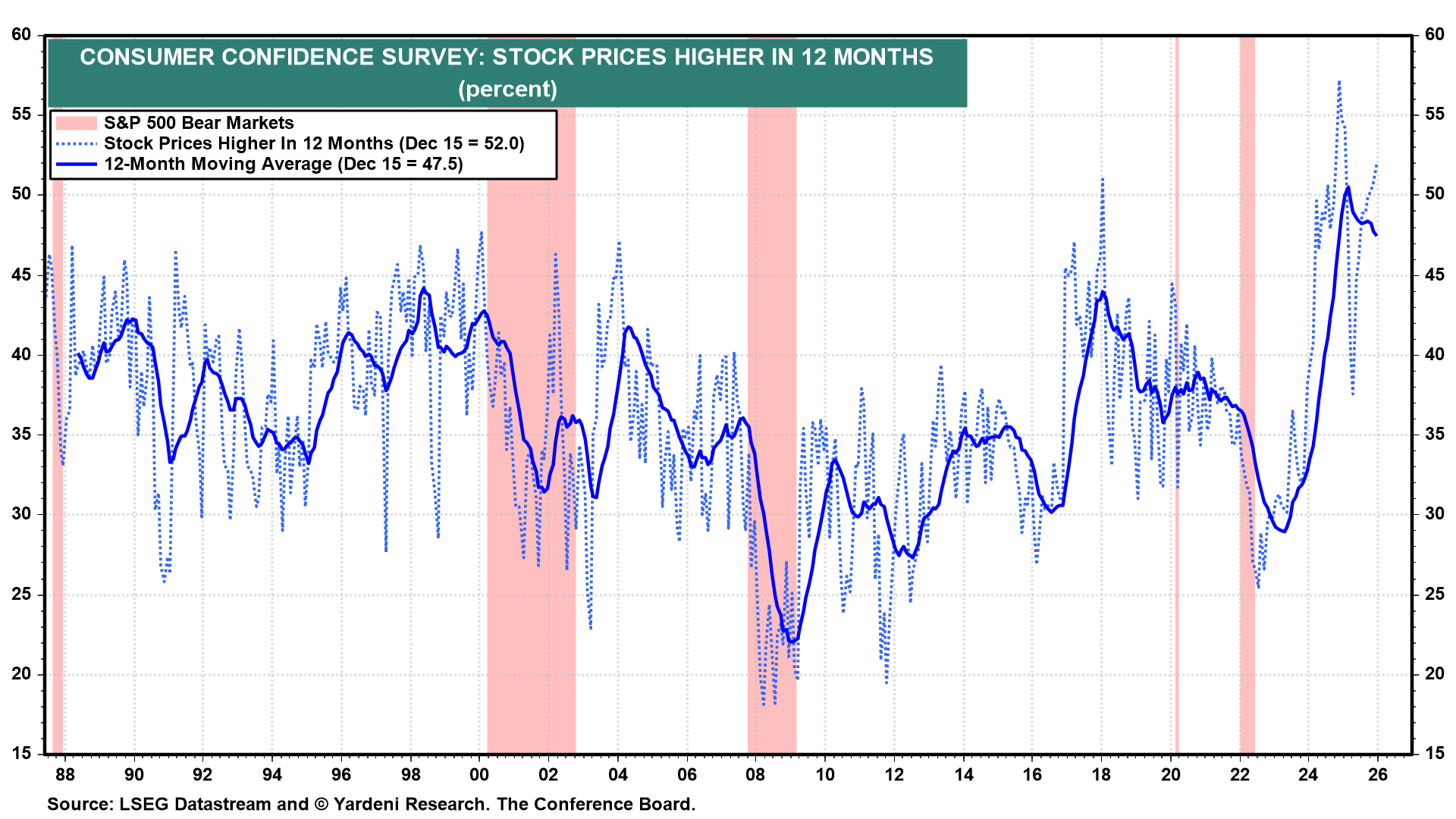 The 12-month average of this series is positively correlated with the forward P/E of the S&P 500 (chart). Both might remain higher for longer if consumers and investors believe, as we do, that a recession over the remainder of the Roaring 2020s is unlikely, as it has not materialized so far this decade.