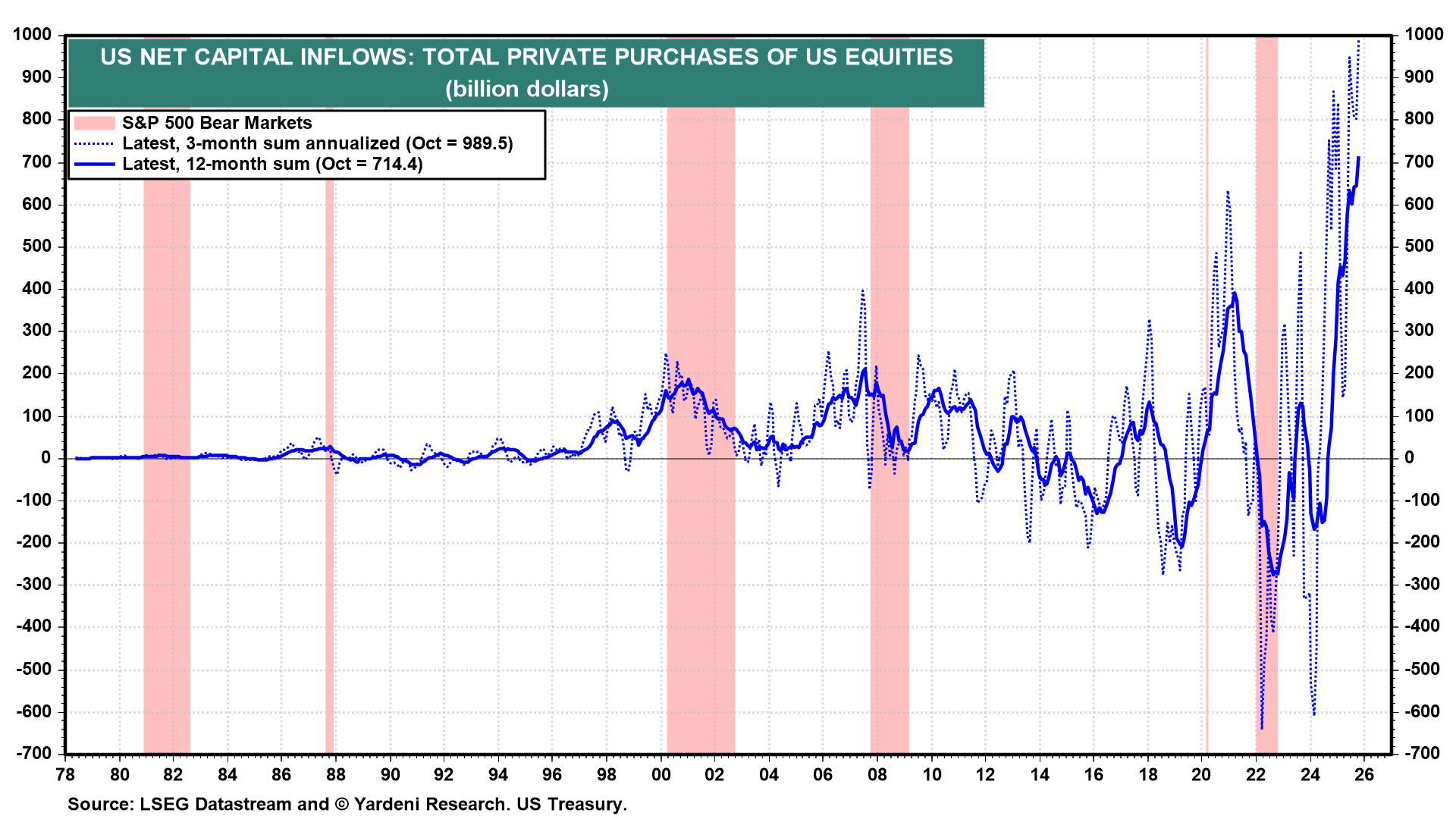 The dollar's weakness in 2025 was widely attributed to net capital outflows from the US to foreign capital markets, especially foreign equity markets. The Treasury's data belie this notion. Indeed, over the past 12 months through October, foreign private purchases of US equities rose to a record $714 billion (chart). The three-month annualized sum rose to almost $1.0 trillion. Historically, heavy foreign buying of US equities has been a bearish signal from a contrarian perspective. The signal certainly hasn't worked recently.