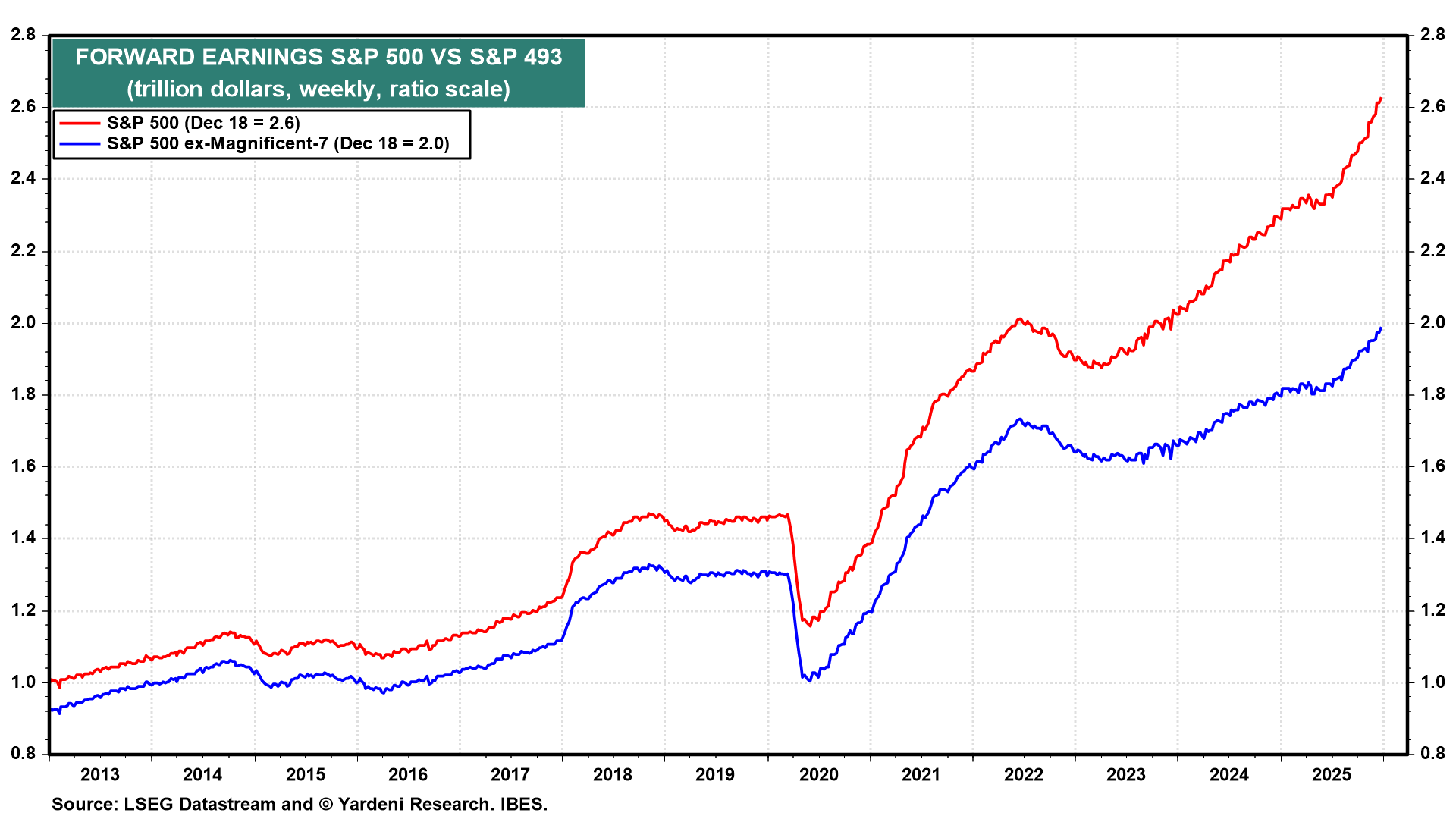 We expect productivity growth to continue booming in 2026, as it did in 2025. If so, the bull market in stocks should broaden to the S&P 500's Impressive-493, i.e., to the users of AI, rather than remaining concentrated among AI producers such as the S&P 500 Magnificent-7. The upward slope of the forward earnings of the Impressive-493 steepened significantly in 2025 (chart). The forward earnings of this composite rose about 10% this year. That's half as much as the increase in the Mag-7's forward earnings, but we expect that increasing competition in the AI space will benefit the Impressive-493 while weighing on the Mag-7.