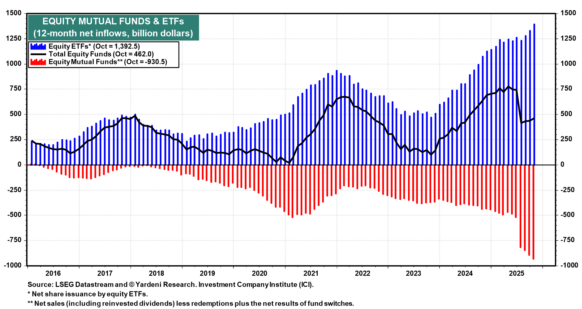 Stock market euphoria is evident in record net inflows into equity ETFs. This might appear to be a bearish signal from a contrarian perspective. However, a big chunk of the funds going into equity ETFs is coming out of equity mutual funds (chart). Equity ETFs' net inflows are on track to exceed a record $1.5 trillion this year, but equity mutual funds' net outflows are likely to total a record $500 billion this year.