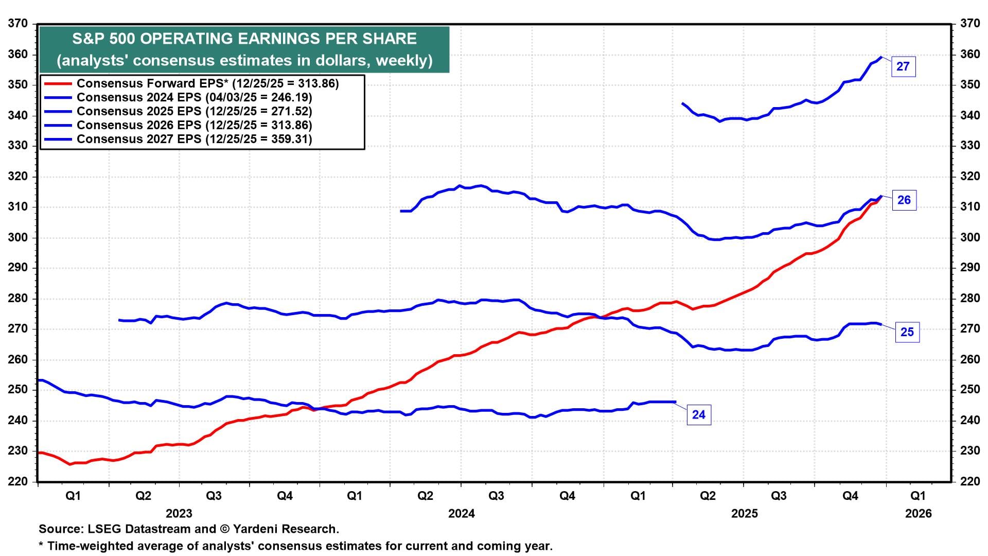 Meanwhile, S&P 500 forward earnings per share rose to yet another record high, of $313.86, during the week of December 25 (chart). The forward P/E is at 22.1. We expect forward earnings to rise about 10% to $350 by the end of 2026, pushing the S&P 500 up by about 10% to 7,700, with the forward P/E remaining around 22.0.