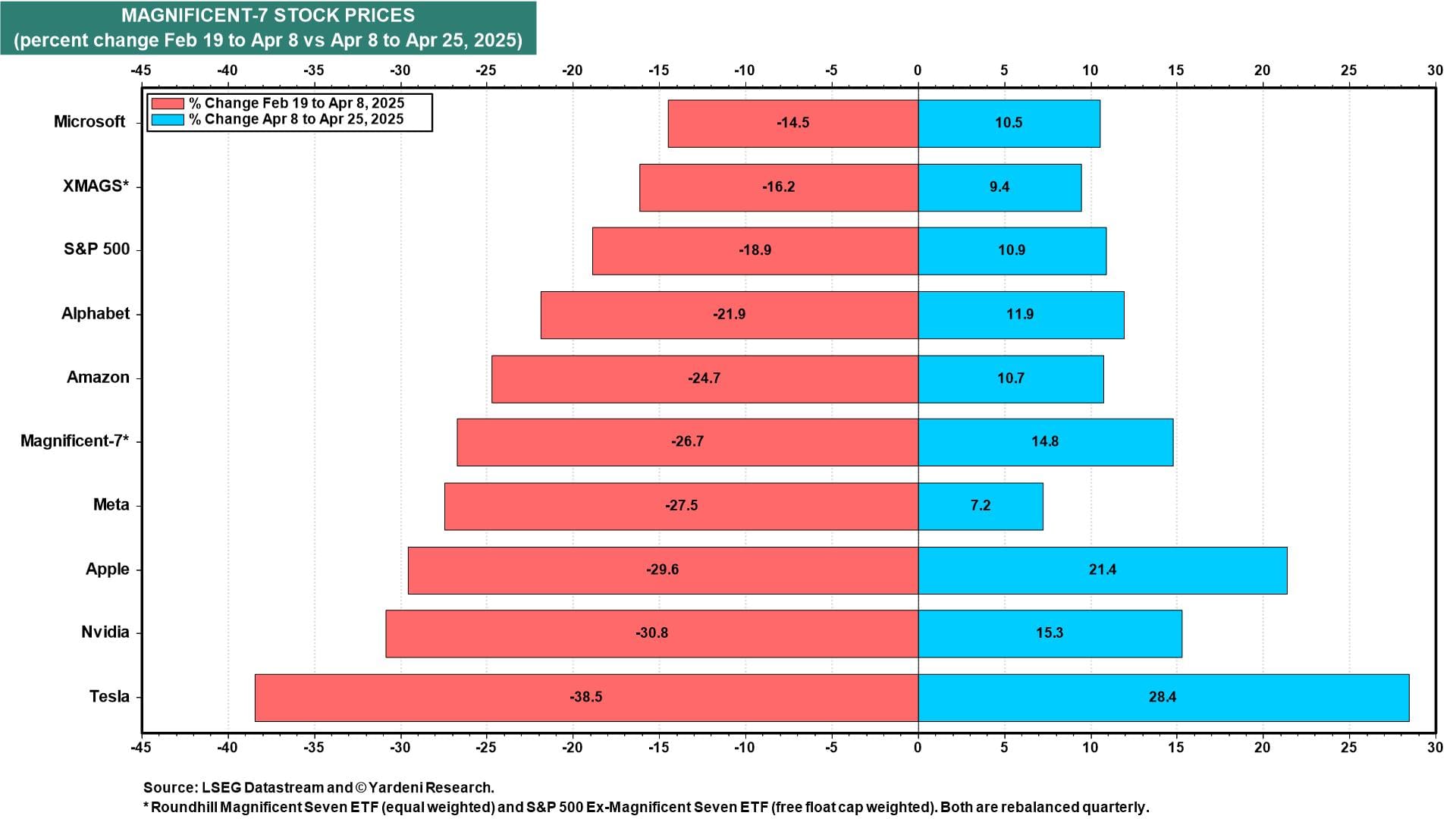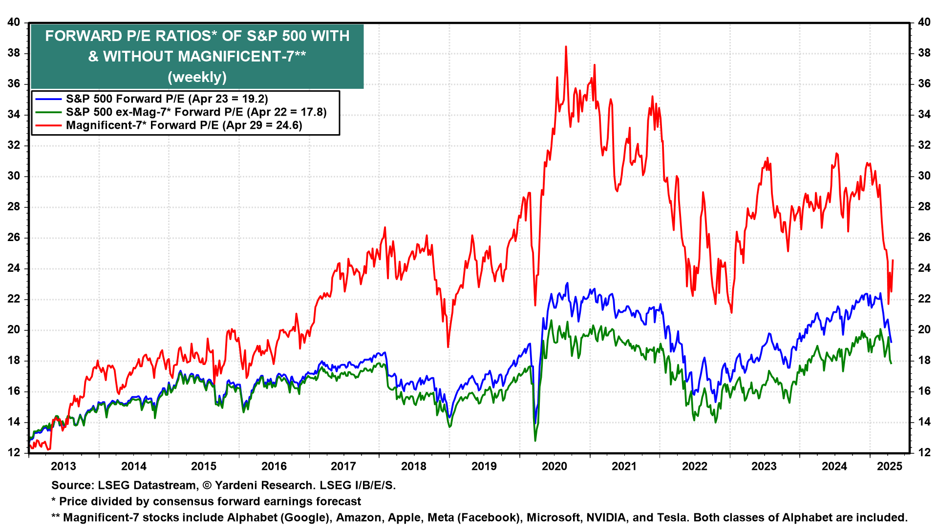 (5) The forward P/E of the Magnificent-7 plunged from 30.0 at the start of the year to 21.7 on April 8 (chart). Over that same period, the forward P/E of the S&P 500 fell from 22.4 to 19.2, while the forward P/E of XMAG declined from 18.6 to 17.8. At those valuation levels, stocks aren't cheap if a recession is coming. They are fairly valued if a soft patch later this year is followed by better growth in 2026. That's our take.