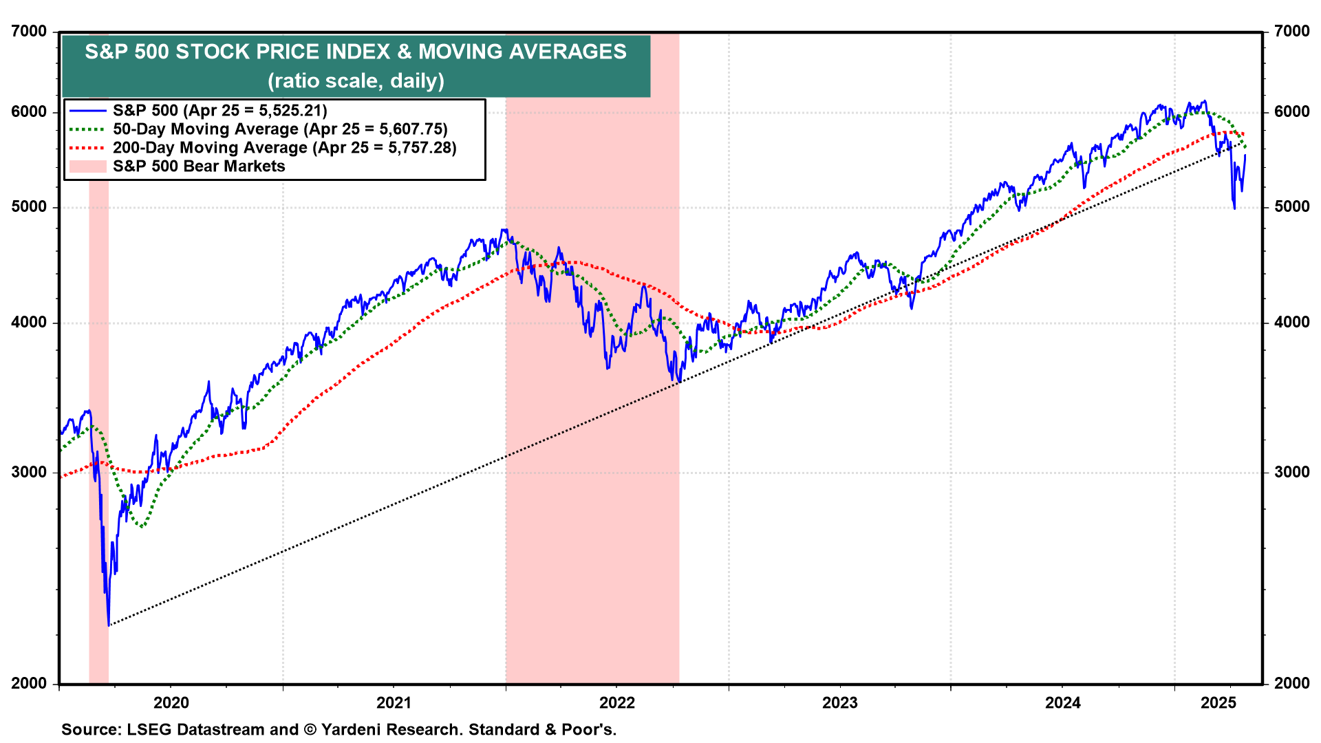 Since late last year, we've been expecting a "choppy" correction during the first half of this year as investors assessed the outlook for Trump 2.0. That's what we are seeing in the charts. Admittedly, the market has been choppier in response to TTT than we expected, and we chopped our year-end target for the S&P 500 from 7000 to 6000 back in March. Now our year-end targets are 7000 in 2026, 8000 in 2027, 9000 in 2028, and (still) 10,000 in 2029.