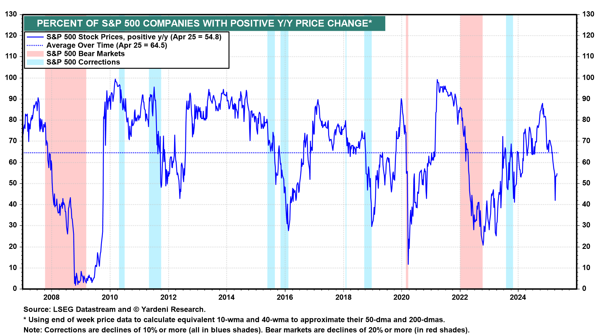 Now some market watchers are seeing a bullish Zweig Breadth Thrust, a technical analysis tool developed by Martin Zweig. It measures market breadth by analyzing the percentage of advancing stocks relative to the total number of stocks (advancing and declining) over a 10-day period. A "thrust" occurs when this indicator rises rapidly from below 40% to above 61.5% within 10 days, suggesting a potential market rally. A similar version of this concept is the percent of S&P 500 companies with positive y/y percent changes (chart). It's shown lots of thrust since April 8, i.e., the day before Liberation Day was postponed for 90 days by President Donald Trump.