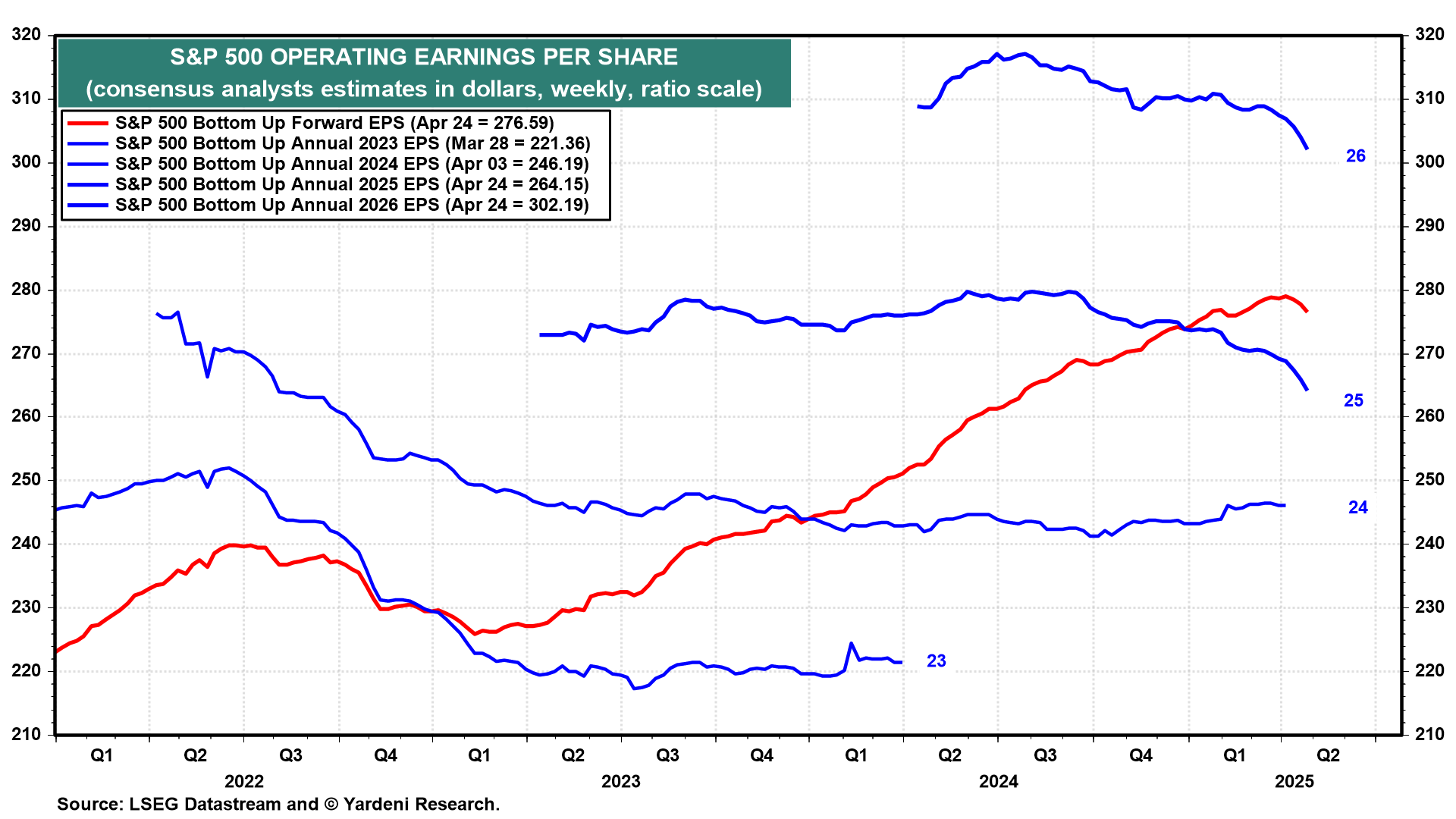 (4) Industry analysts are reducing their expectations for S&P 500 earnings this year and next year (chart). Forward earnings peaked at a record high in late March. It has declined since then through the April 24 week. So the recent rebound in stock prices is all attributable to a rising forward P/E, as investors may be starting to discount a resumption of our Roaring 2020s scenario—hinging on a tech-led boom in productivity growth—in 2026.