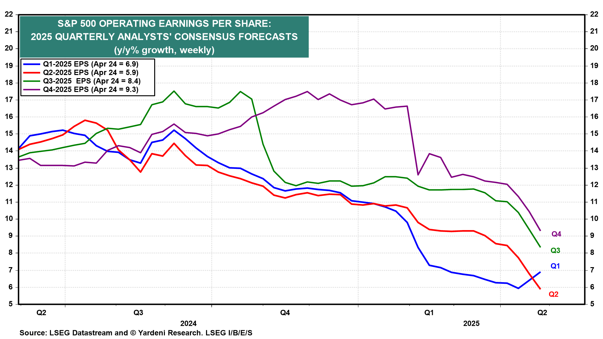 (3) Industry analysts are scrambling to lower their S&P 500 earnings growth forecasts for the remaining three quarters of this year (chart). They are anticipating that if the tariff war between the US and China doesn't end soon, the result might be a recession during the second half of this year. Stock investors may be looking beyond that to a better outlook for 2026.