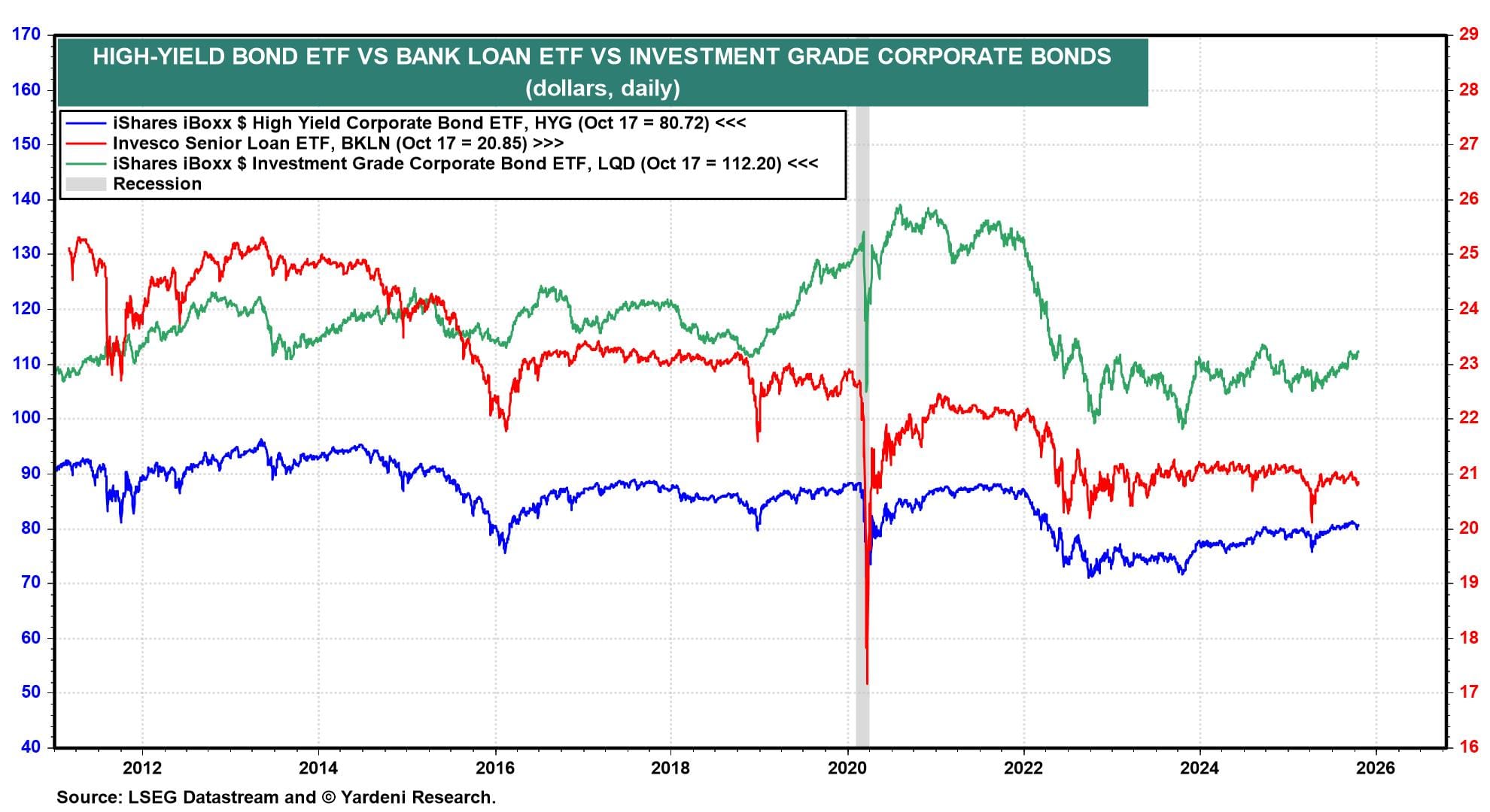 On the other hand, ETFs that track the high-yield and investment-grade corporate bond markets have held up well so far this year and so has an ETF tracking senior loans (chart).