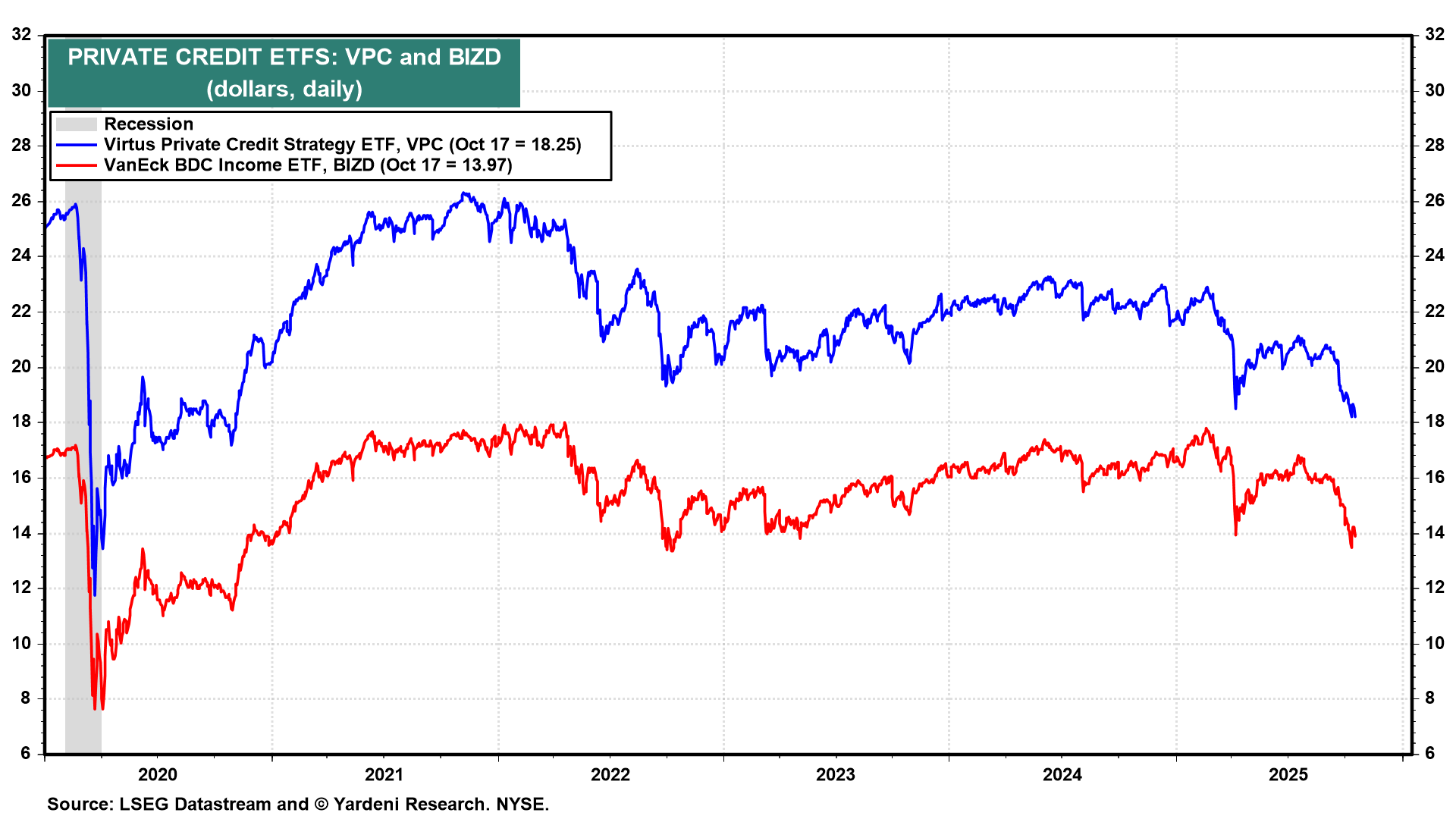 Investors have also been spooked by fears of trouble in the private credit market since First Brands filed for Chapter 11 bankruptcy protection on September 29, 2025, disclosing liabilities of between $10 billion and $50 billion and assets in the range of $1 billion to $10 billion. ETFs tracking the private credit market tumbled during September and are lower than the “Annihilation Days” which followed the April 2 “Liberation Day.”