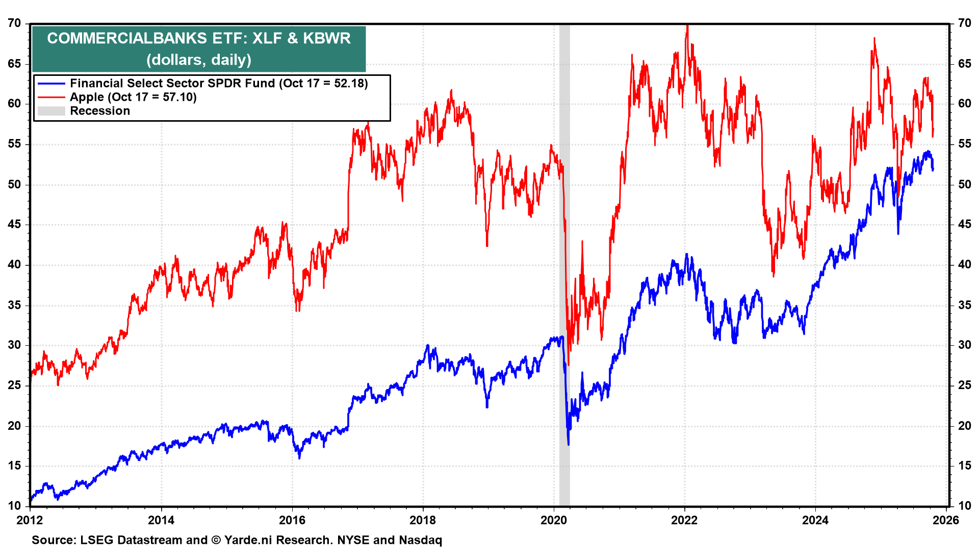 Much will depend on investors' assessments of the credit markets. They were spooked last week (just ahead of Halloween) by news that Zions Bancorp incurred a $50 million charge-off in Q3 due to legal actions against two borrowers. Stock prices dropped sharply on Thursday, led by the KBW Regional Banking ETF (chart).