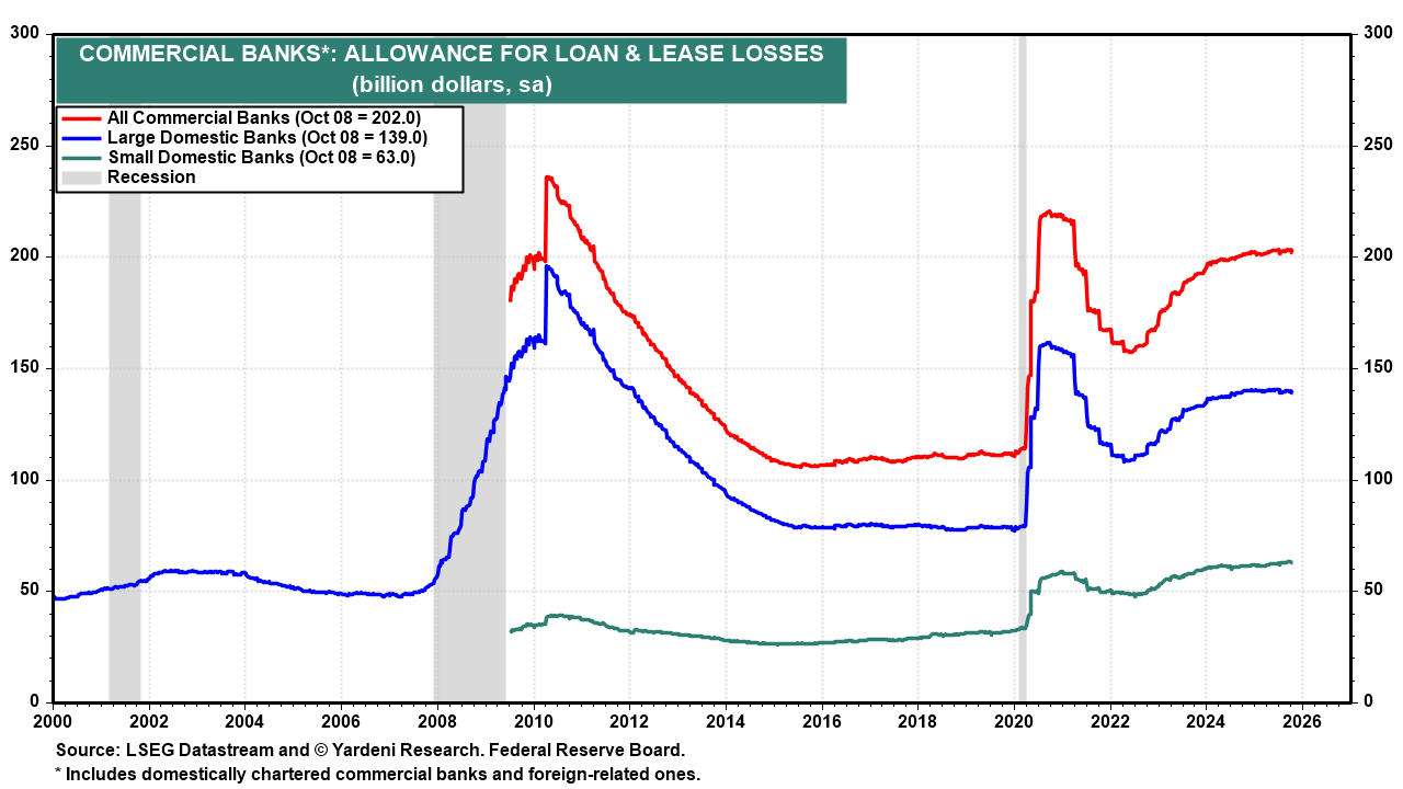 We don't expect credit problems that will add up to serious systemic risk of an economy-wide credit crunch, which has often caused recessions in the past. We are encouraged to see that the Fed's data on commercial banks’ loan-loss reserves remains relatively stable so far this year (chart).
