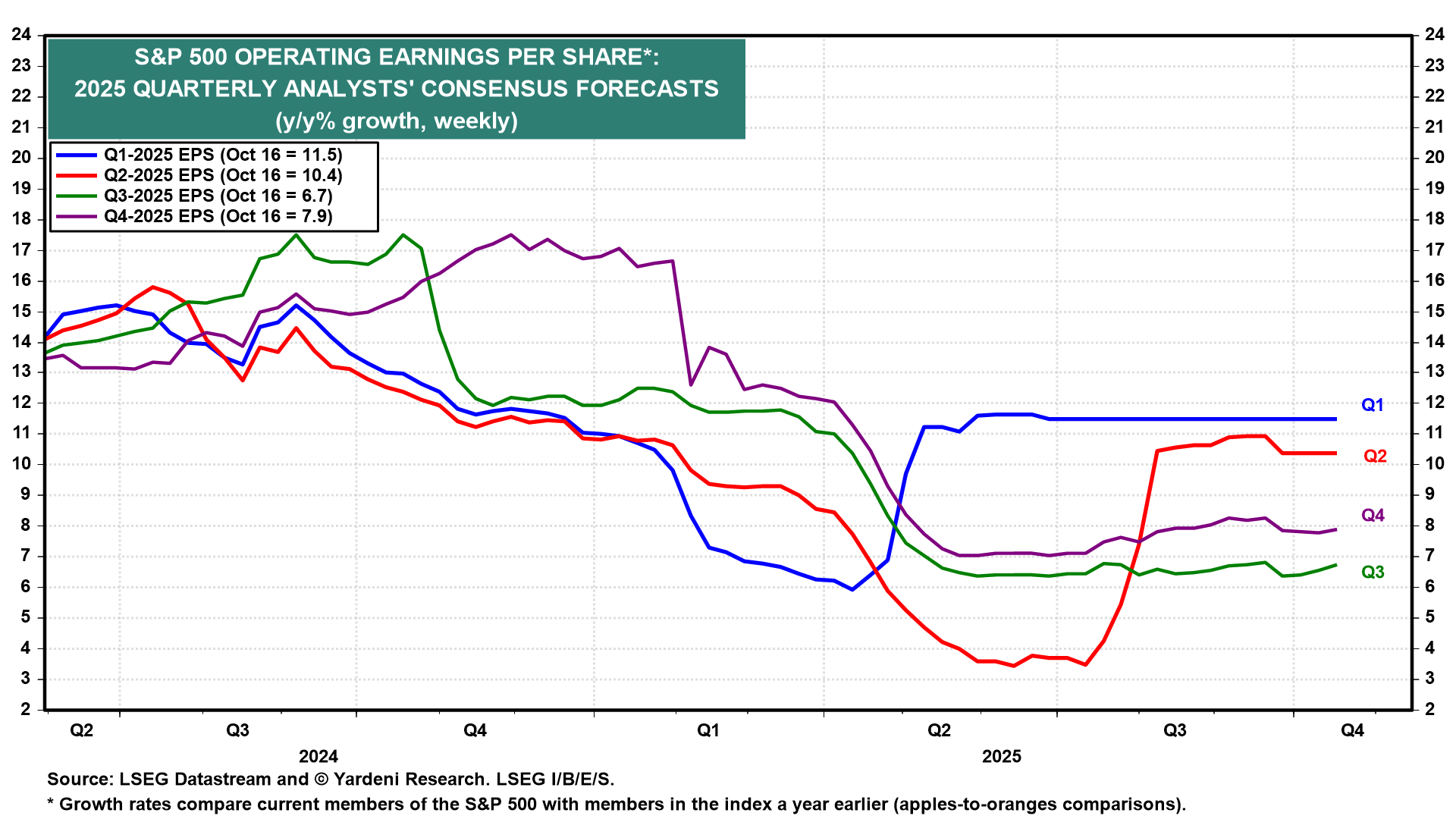 S&P 500 forward earnings per share rose to yet another record high last week, of $297.27; it has rapidly been converging toward analysts' 2026 consensus expectation, currently at $304.55, which it will match at year-end (chart). The current forward P/E—i.e., the multiple using forward earnings as the “E”—is 22.4.