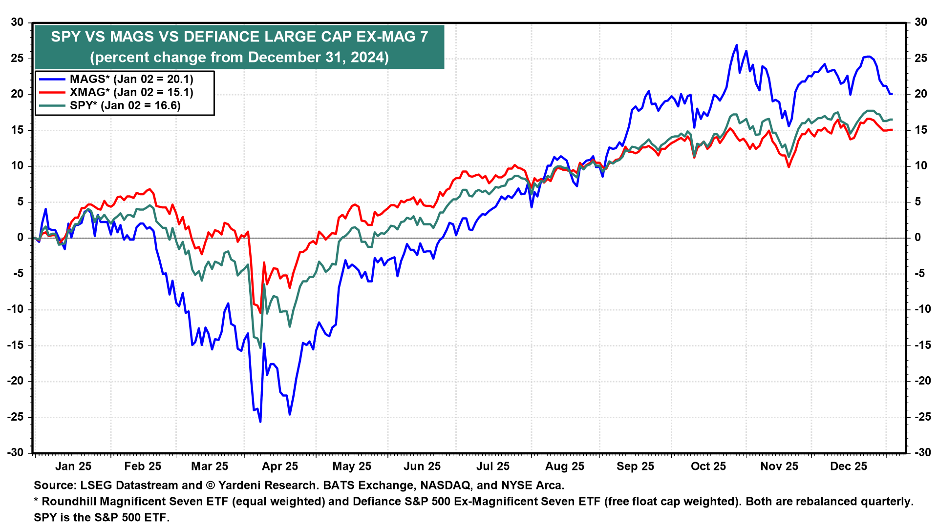 The good news is that the outlook for S&P 500 earnings remains solid for the year ahead. Industry analysts who follow companies in the index collectively expect S&P 500 earnings per share to rise 15.6% in 2026 to $313.84 (chart). For next year, they are forecasting $359.44. We are forecasting $310 and $350 for the two years.