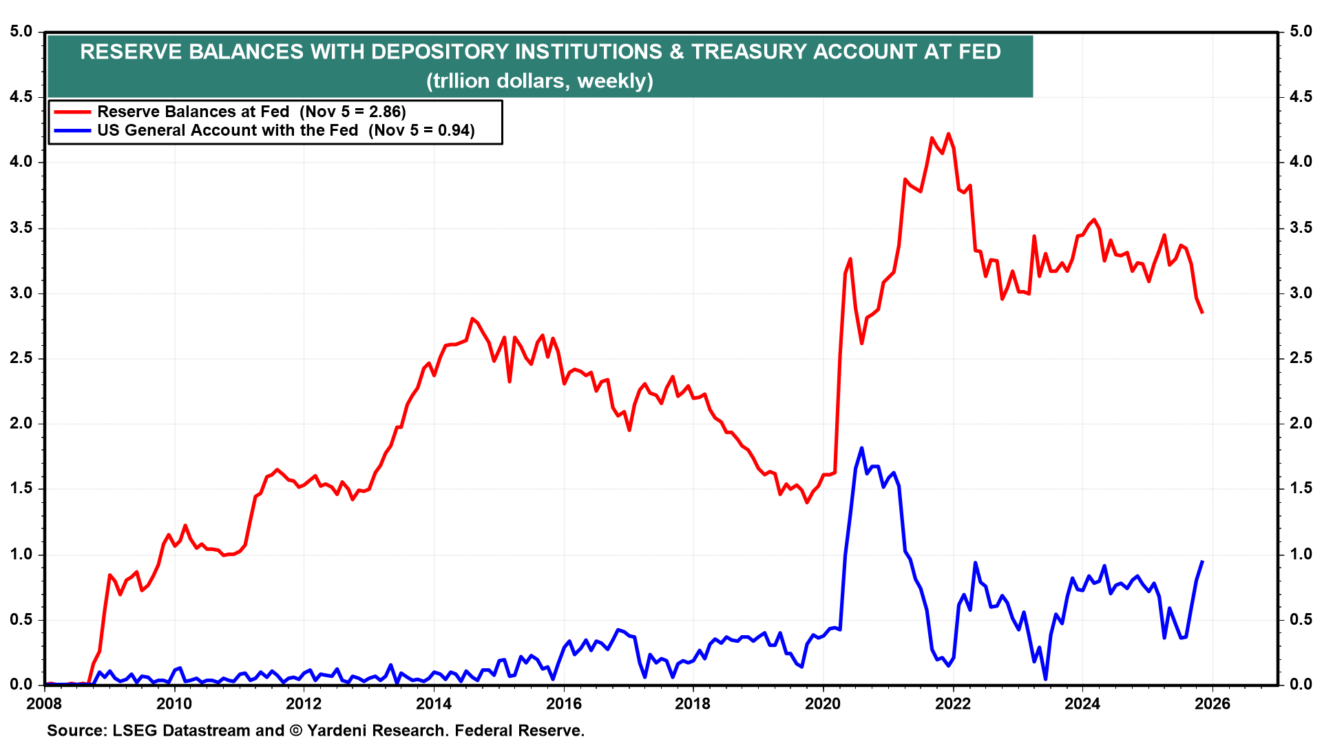 We expect that the government shutdown will end soon, and certainly before Thanksgiving. That should relieve some of the stress in bank liquidity. As a result of the shutdown, the US Treasury's cash balance has risen, leading to a decline in bank reserves (chart).