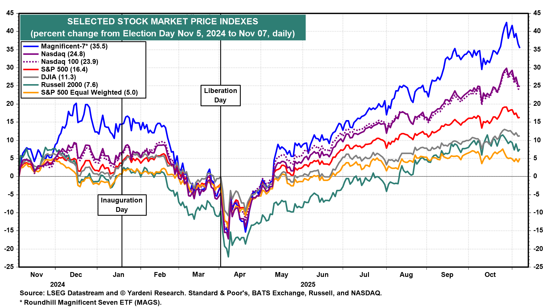 The S&P 500 peaked at a record high of 6890.59 on October 28 (chart). It is down 2.4% since then. It retested its 50-day moving average on Friday, falling slightly below it around noon. It then closed higher on the day on hopes that a compromise proposal from the Democrats might end the government shutdown. Negotiations are reportedly happening, but they remain tense and far from resolution.