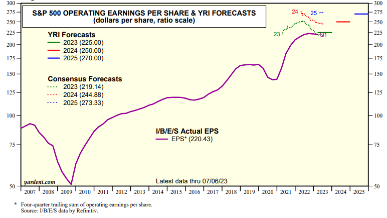 So we see the bull market that started on October 12, 2022 continuing through at least the end of next year with the S&P 500 reaching a new record high somewhere between 4800 and 5400 over the next 18 months (with a forward P/E of 17.8 to 20.0 on $270 forward earnings).