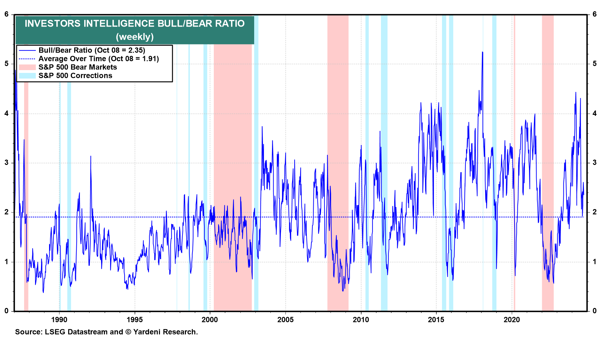 The S&P 500's latest bull market turned two-years old on Saturday. It started on October 12, 2022. Sentiment was extremely bearish back then (chart). There were widespread fears of a recession caused by the tightening of monetary policy. Those fears lingered through October 4 of this year, when a stronger-than-expected employment report once again confirmed that the young bull correctly discounted that inflation would fall while the economy remained resilient. That's been our forecast since early 2022.