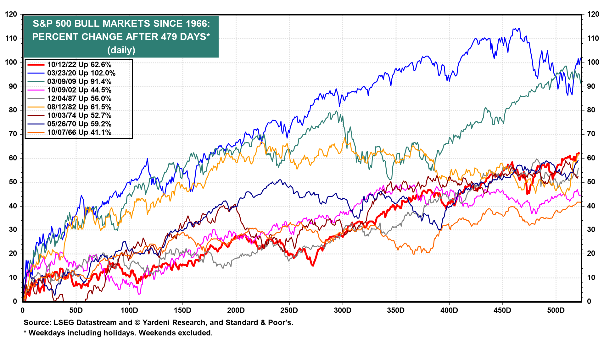 Since the latest bear market bottom, the S&P 500 is up 62.6% through Friday's close (chart). That's par for the course compared to the previous eight bull markets. In our Roaring 2020s scenario, the S&P 500 reaches 8000 by the end of the decade mostly led by rising earnings rather than rising valuation multiples.